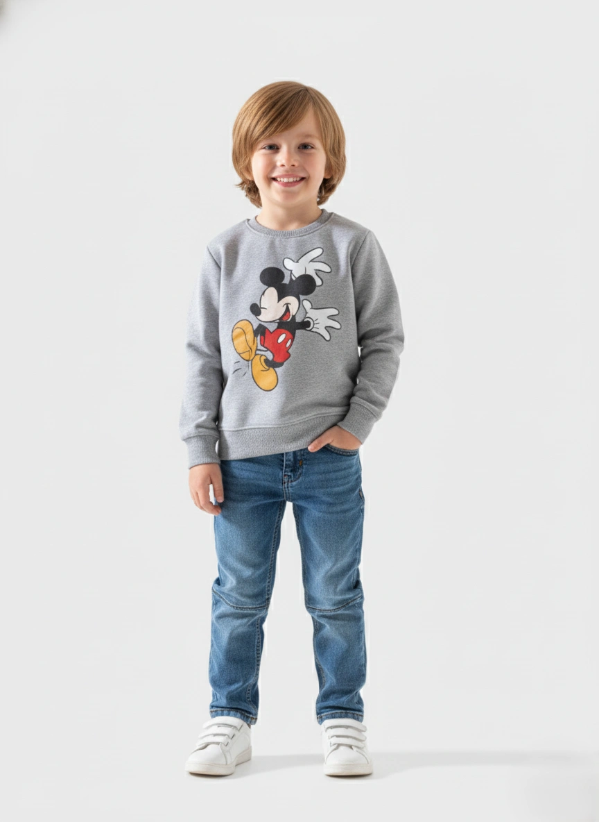 سويتشيرت ولادي شتوي رقبة دائرية بلون رمادي. يتميز بطبعة كبيرة وواضحة لشخصية ميكي ماوس الكرتونية. قماش قطني مبطن ودافئ لـ ملابس الأولاد (1-5 سنوات).