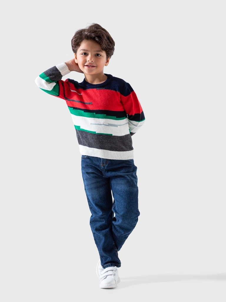 سويت شيرت أولادي شتوي كنزة مقلمة. يتميز بخطوط عريضة باللون الأحمر والأخضر والكحلي والأبيض.Boys Multi-Color Sweater | بلوفر تريكو