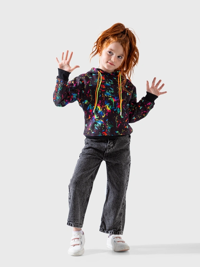 سويت شيرت بناتي شتوي بقبعة من قماش سميك. يتميز بلون أسود ونقشة سبلاش ملونة وزاهية. قطعة دافئة وعصرية لـ ملابس البنات (1-3 سنوات).