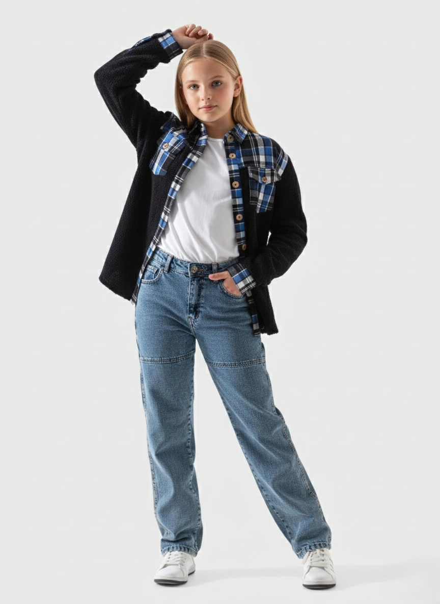 أحصلي على إطلالة شتوية عصرية ومريحة مع هذا الشميز الجاكيت البناتي (Shacket). إنه مثالي كطبقة خارجية أنيقة ودافئة. الشميز متوفر بمقاسات الفتيات (من 6 لـ 16 سنة).