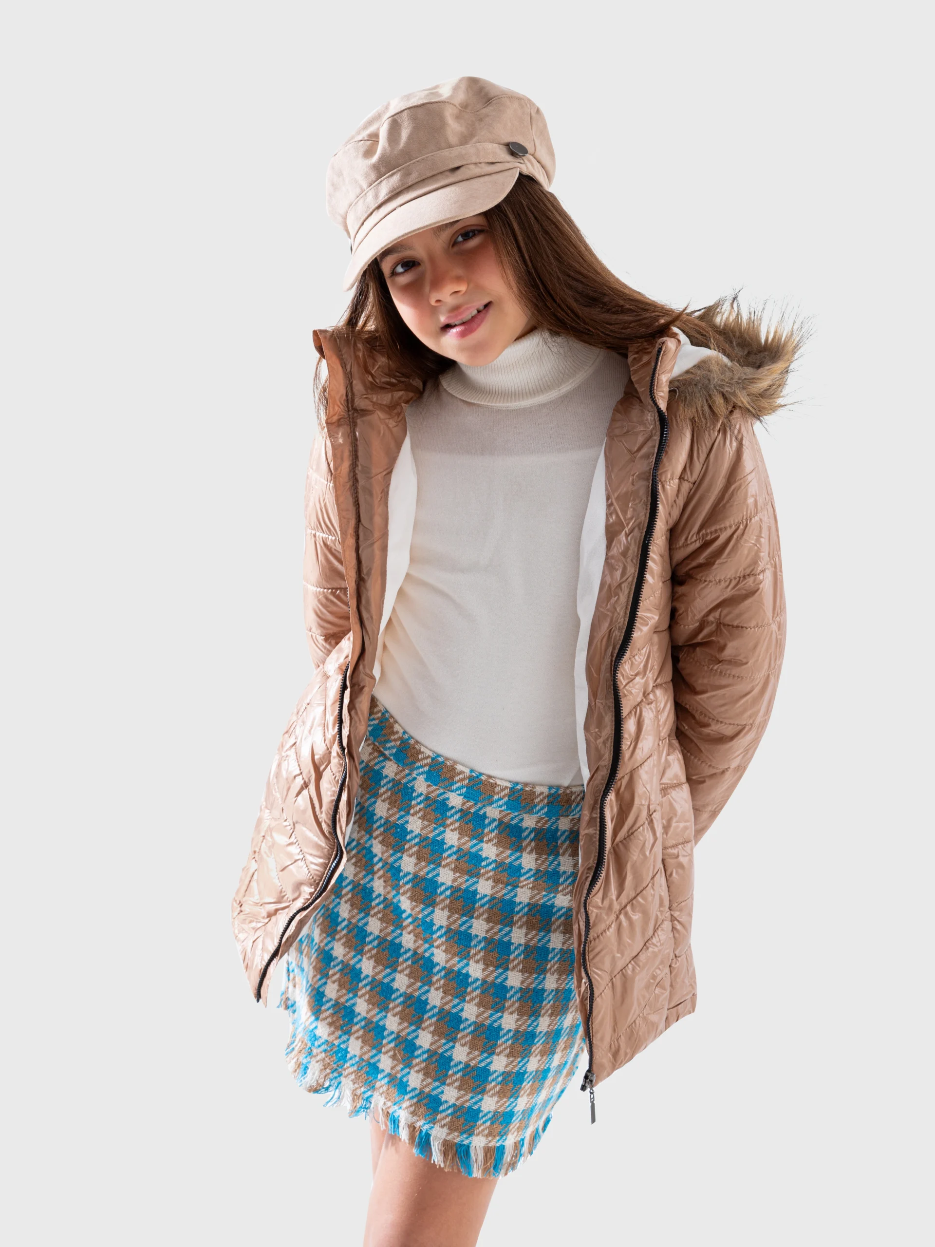 امنحي إطلالة ابنتك لمسة كلاسيكية عصرية مع هذه السكيرت الشتوية الميني (Mini-Skirt) المصممة خصيصًا للأجواء الباردة. هذه التنورة مناسبة لمرحلة المراهقة المبكرة (متوفرة بمقاسات: 6 لـ 16 سنة)، وهي قطعة رائعة ترتقي بمظهرها الشتوي.