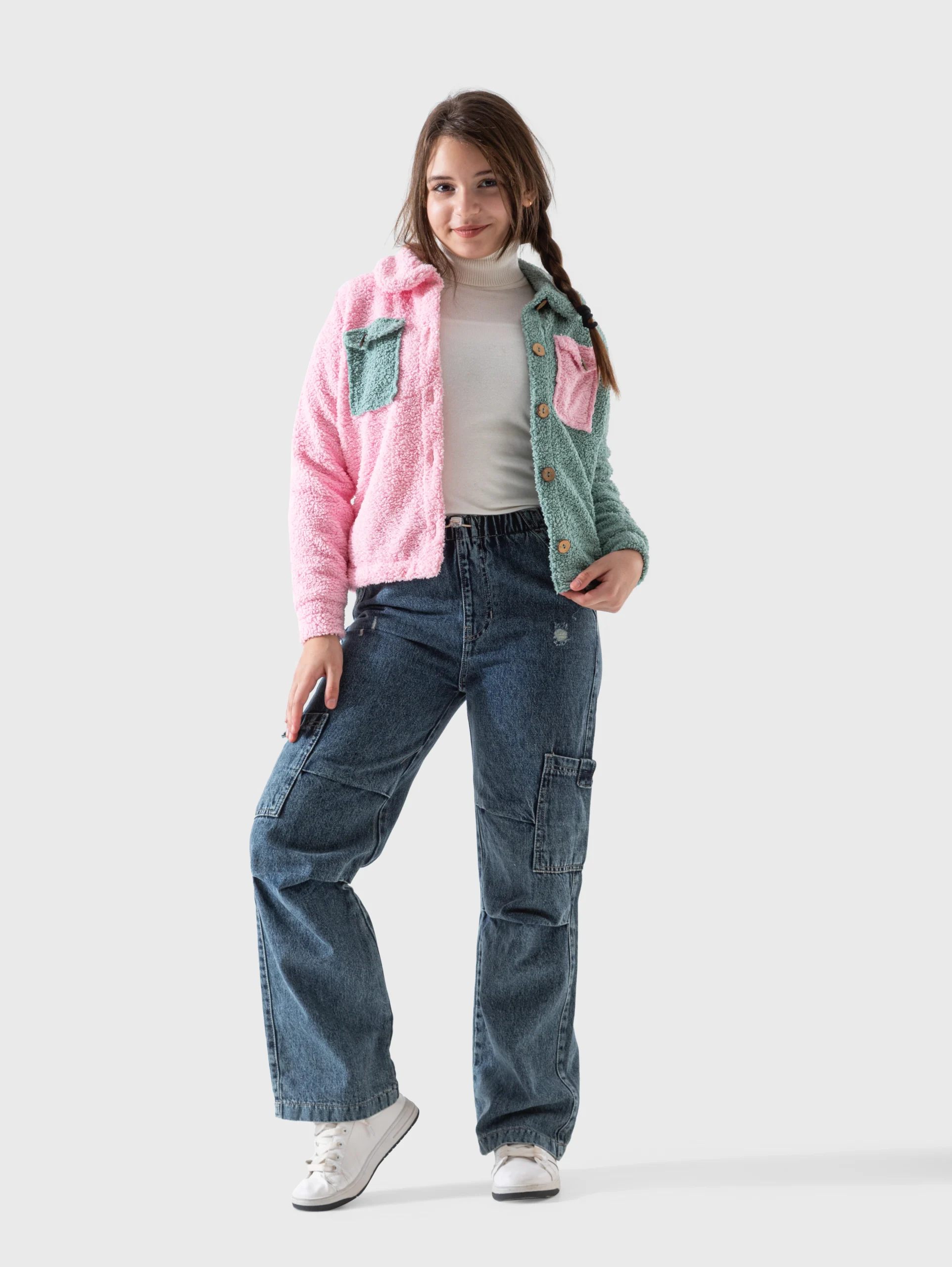 الجاكيت مصنوع من الفرو التيدي (الشيربا) السميك والناعم. يتميز بتصميم مقسوم الألوان (Color Block) الجريء. يجمع بين اللونين الوردي الفاتح والأخضر المائي (Mint Green). يأتي الجاكيت بياقة قميص وتصميم “شاكيت” (Shacket) عصري. كما يحتوي على جيوب على الصدر بألوان متباينة تزيد من جاذبيته. هذه القطعة تضمن الدفء في الطقس البارد دون التضحية بالموضة.