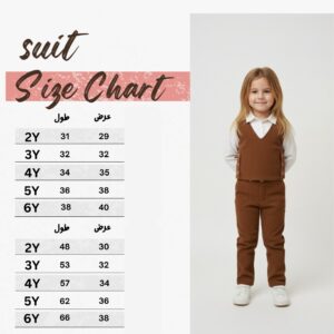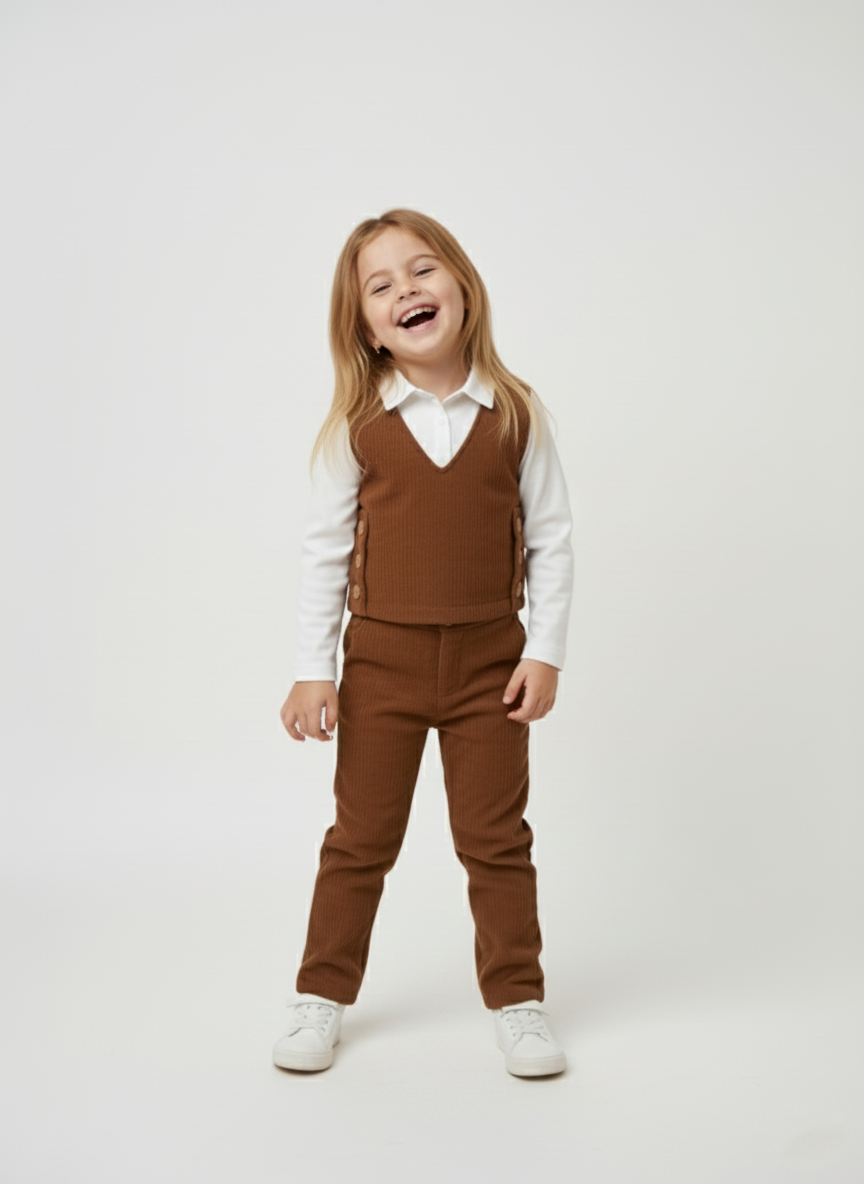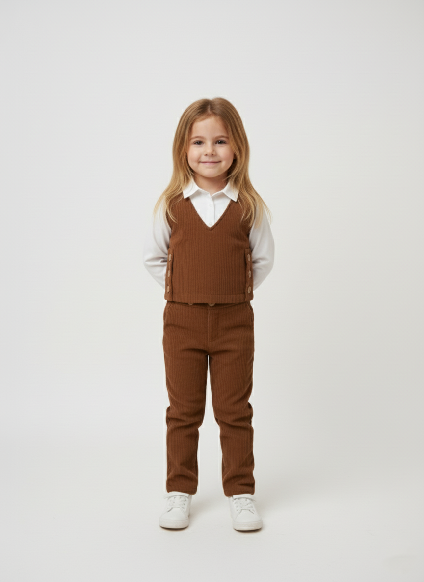 نقدم لكِ سوت بناتي شتوي رسمي فريد، مصنوع من قماش الكوردروي (Corduroy) الدافئ باللون البني الجذاب. هذا الطقم مكون من قطعتين أساسيتين: صديري (فيست) أنيق على شكل حرف V مزود بأزرار خشبية جانبية تضفي تفصيلاً راقياً، وبنطلون كوردروي مريح بقصة مستقيمة.