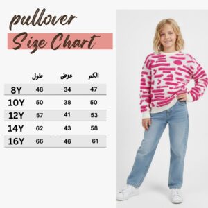نقدم لكِ كنزة صوفية بناتي شتوية محبوكة سميكة باللون الأبيض السكري، مزينة بنقوش فوشيا عصرية. الكنزة مثالية لتدفئة طفلتك في أيام الشتاء وتناسب مقاسات (8-16 سنة). تتميز الكنزة بياقة دائرية كلاسيكية وأكمام طويلة مريحة.