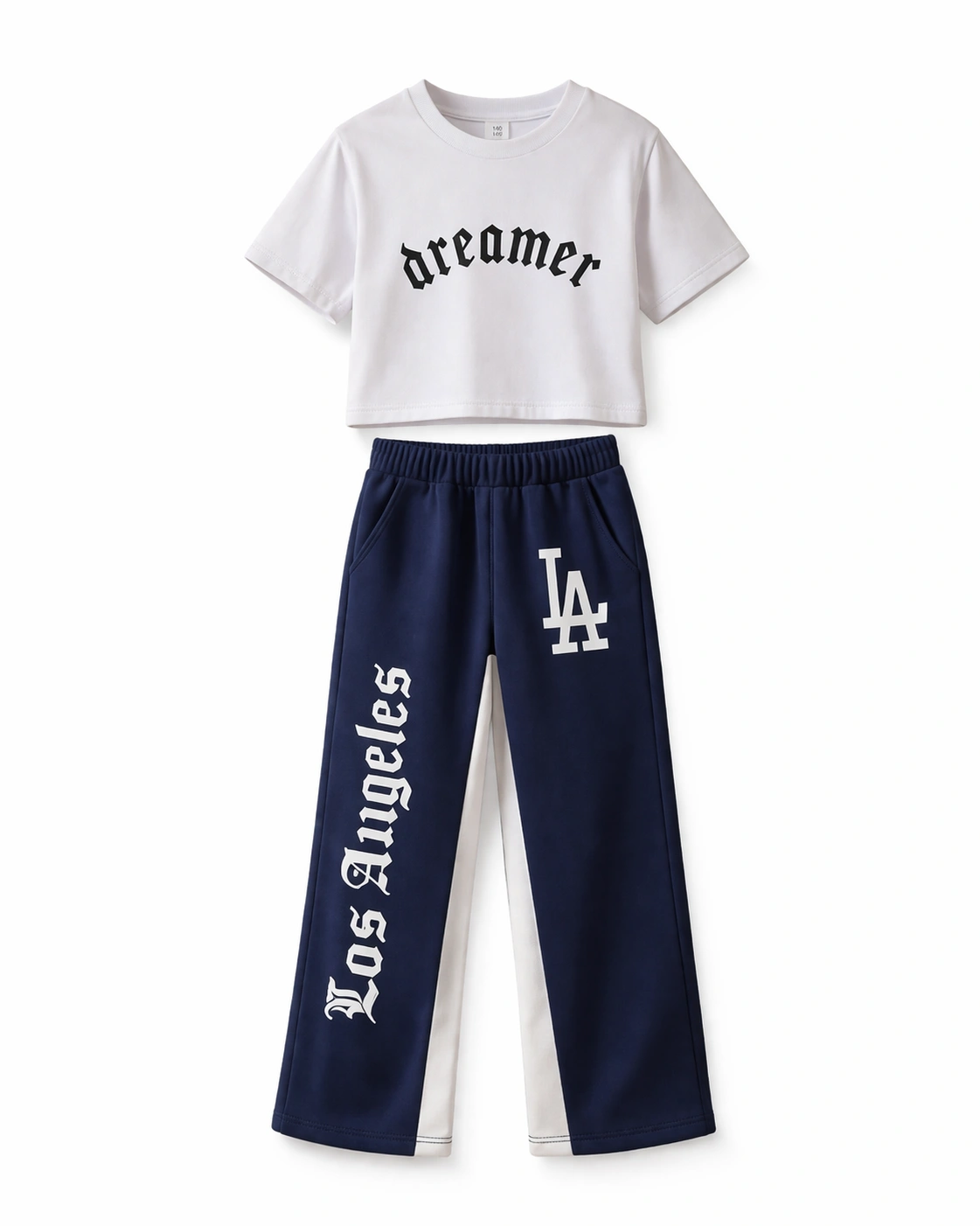 ملابس أطفال صيفية بتصميم “سوت” (Set) رياضي كاجوال يجمع بين الشياكة والراحة المطلقة من براند A&A. يتكون الطقم من قطعتين: “كروب توب” أبيض ناصع بكلمة Dreamer بخط قوطي مميز، وبنطلون واسع باللون الكحلي الأنيق مع تفاصيل جانبية بيضاء وطبعة Los Angeles. صممنا هذا الطقم ليناسب حركة بناتى بيبى النشيطة، حيث استخدمنا قطن بيكيه ناعم يسمح بتهوية الجسم في حرارة الصيف العالية.