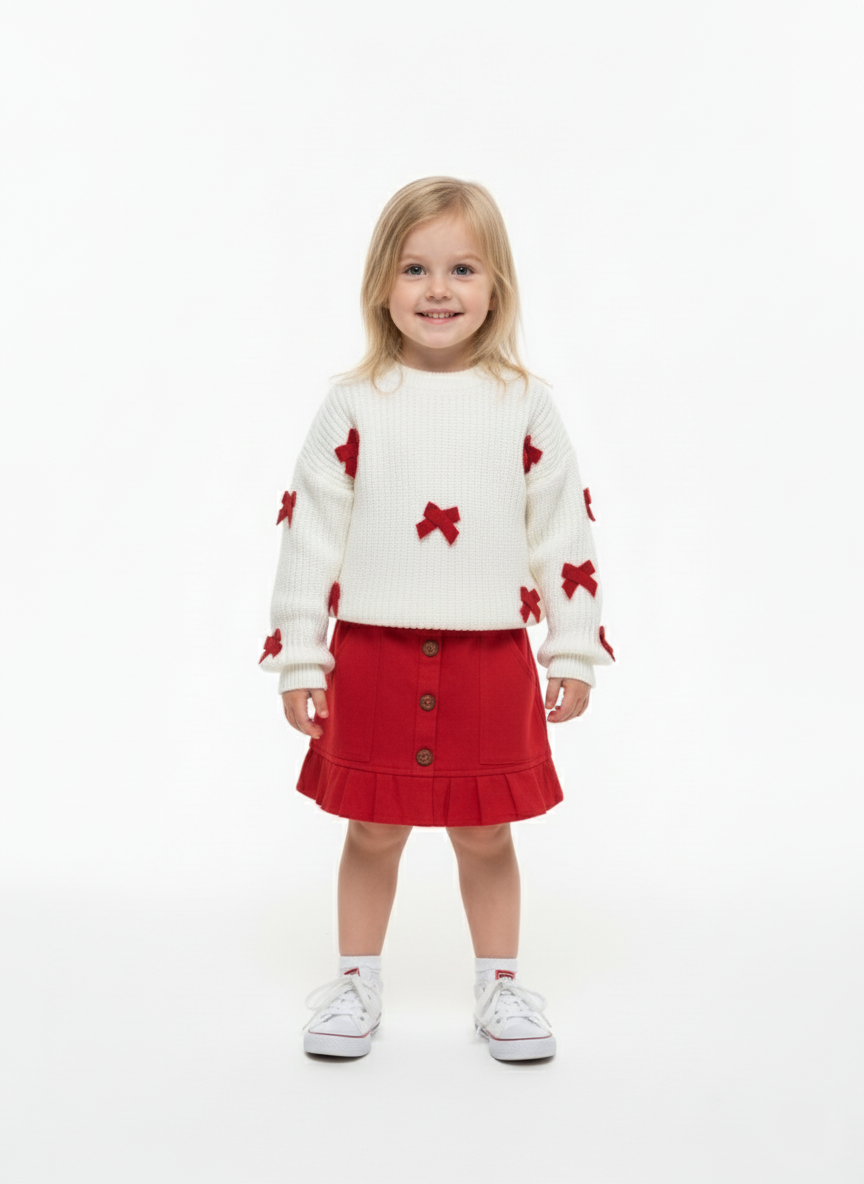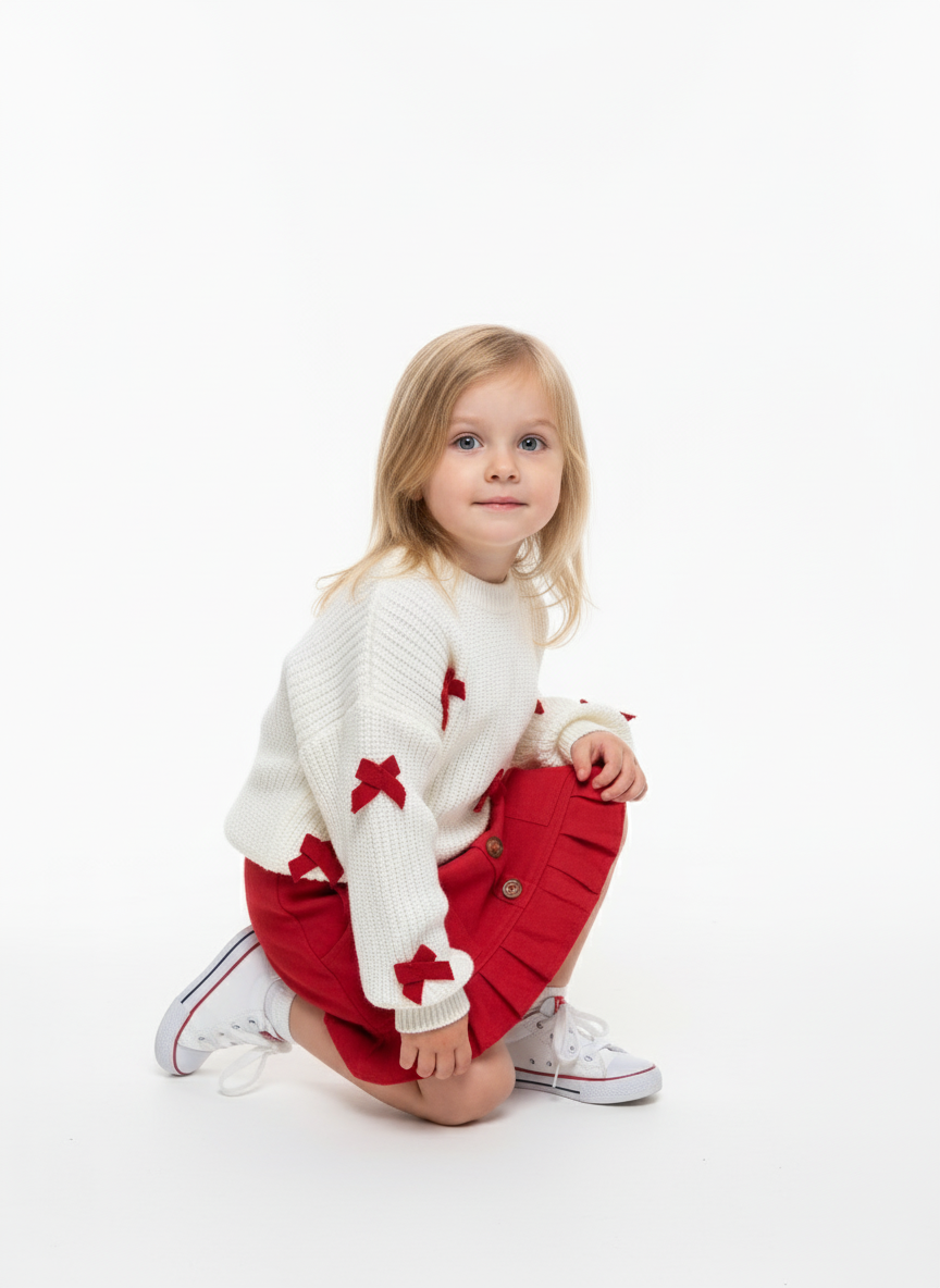 طقم بناتي بلوفر وجيبة أبيض وأحمر – ملابس أطفال شتوية بفيونكات 2026Girls Elegant Bows Sweater Skirt Set | سوت بناتي