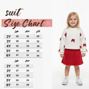 تأتي البلوزة منسقة مع تنورة حمراء أنيقة تتميز بتفاصيل أزرار أمامية أنيقة وقصة زمزمة قصيرة، مثالية للحركة واللعب. الخامة الصوفية للبلوزة وقماش التنورة السميك يوفران لطفلتك الدفء الكامل والراحة الفائقة في أيام الشتاء الباردة، مما يجعله طقمًا مثالياً للمناسبات العائلية.