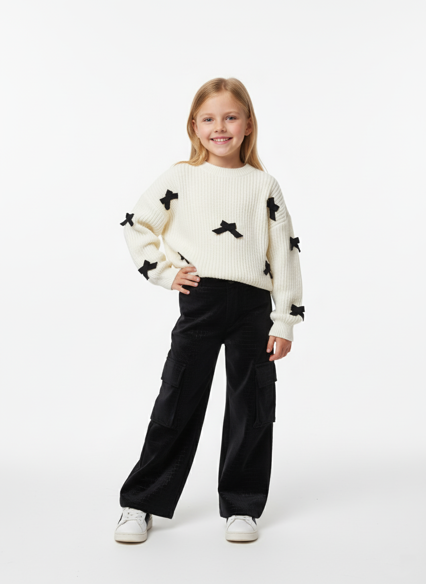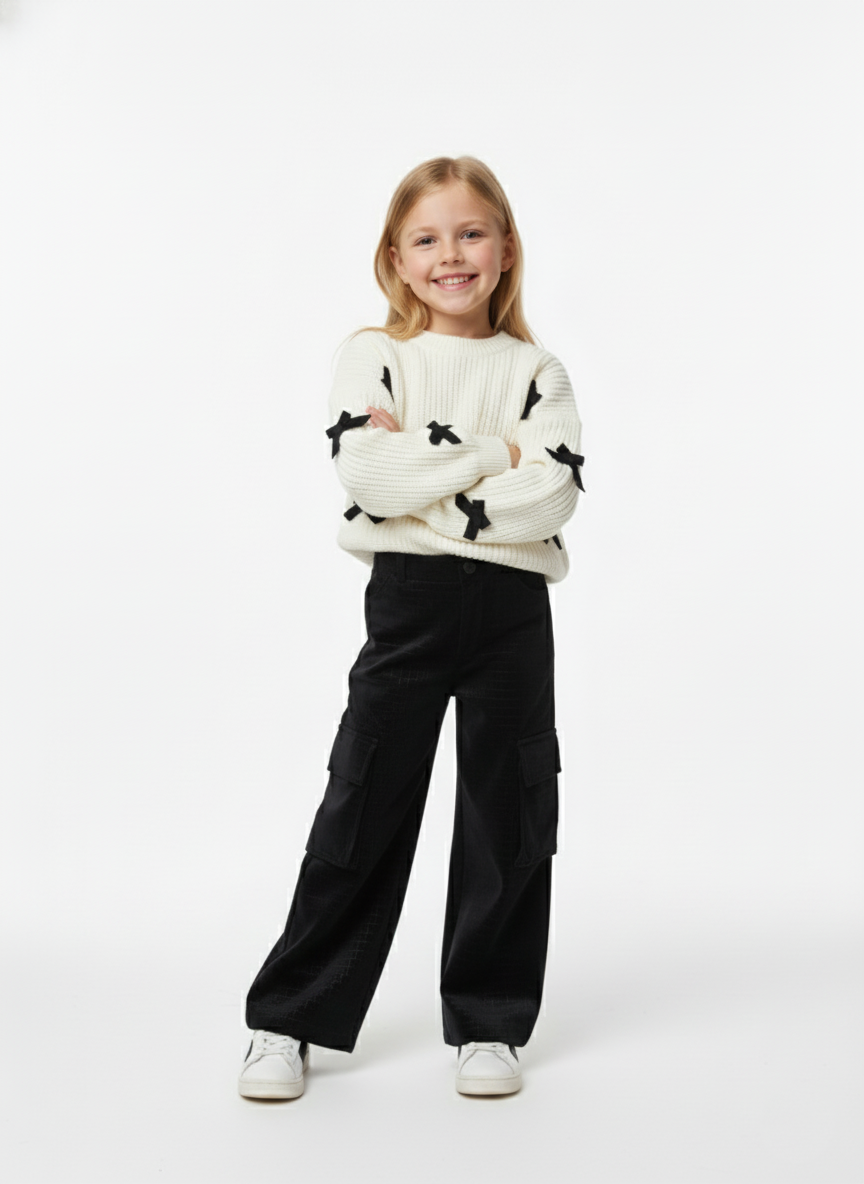 تأتي البلوزة منسقة مع بنطلون كارجو أسود بـ “قصة رجل واسعة” (Wide Leg) من قماش الكوردروي الدافئ. هذا البنطلون العملي مزود بجيوب جانبية (Cargo Pockets) تعكس أسلوب الشارع العصري. الخامة الصوفية وبنطلون الكوردروي يوفران لطفلتك الدفء الكامل والراحة الفائقة في أيام الشتاء الباردة.