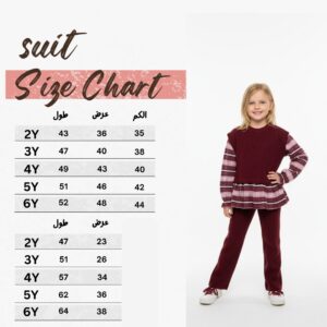 يتميز السوت بتفاصيل مخططة بالوردي والأبيض على الأكمام وأسفل البلوزة، مما يضفي حيوية على اللون العنابي الكلاسيكي. الخامة التريكو السميكة تضمن لطفلتك الدفء الكامل والراحة في أيام الشتاء الباردة، مما يجعله مثالياً للمناسبات العائلية أو أيام المدرسة.