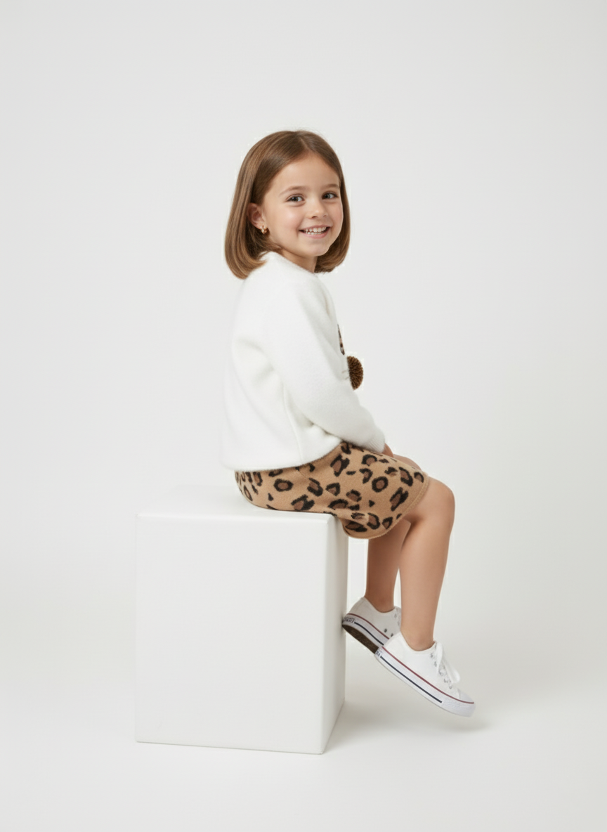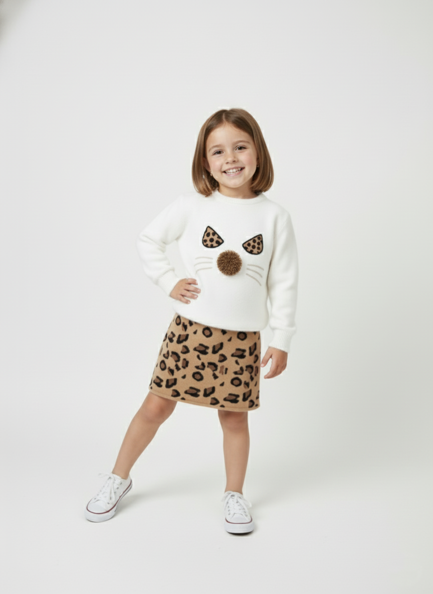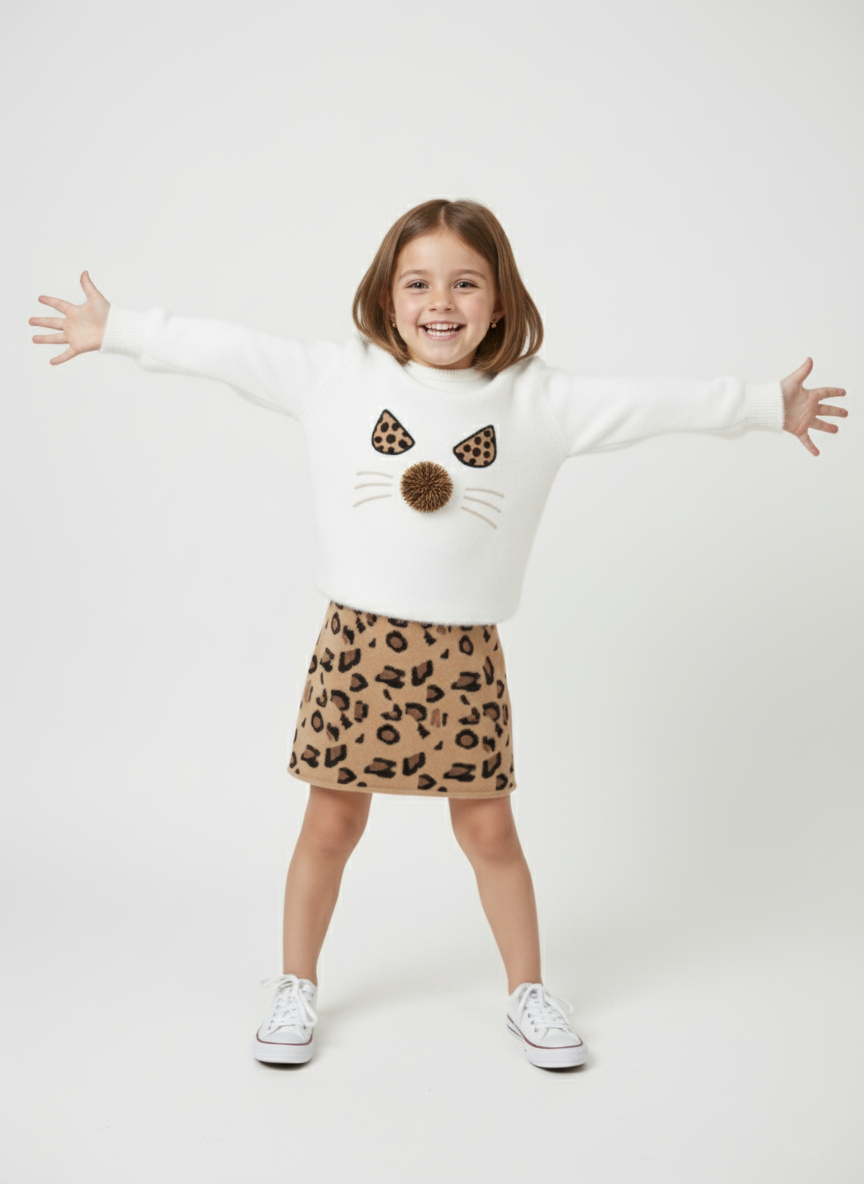 نقدم لكِ سوت بناتي شتوي متكامل، يجمع بين الأناقة والمرح في آن واحد. يتكون الطقم من بلوزة صوفية بيضاء ناعمة مزينة بتصميم وجه قطة مرح، مع آذان مطرزة وكرة فرو بارزة كأنف.