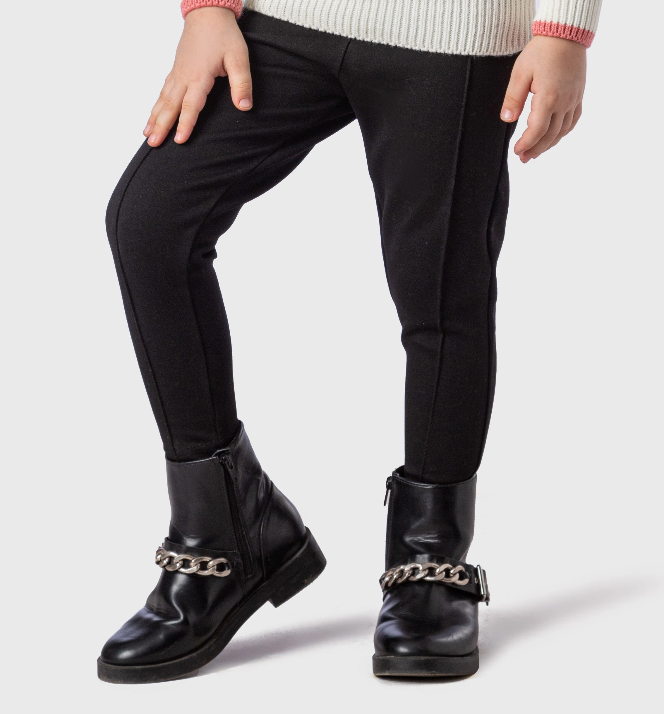 البنطلون بلون أسود سادة ومتعدد الاستخدامات. الخامة المستخدمة سميكة ومرنة، مما يوفر الدفء والحرية في الحركة. يتميز بخطوط خياطة أمامية (Pintuck/Seam) تعطي مظهراً مشابهاً للبنطلونات الكلاسيكية. هذا التفصيل يضيف لمسة أكثر أناقة من الليجن العادي. الخصر المطاطي يضمن ثباتاً وراحة طوال اليوم.