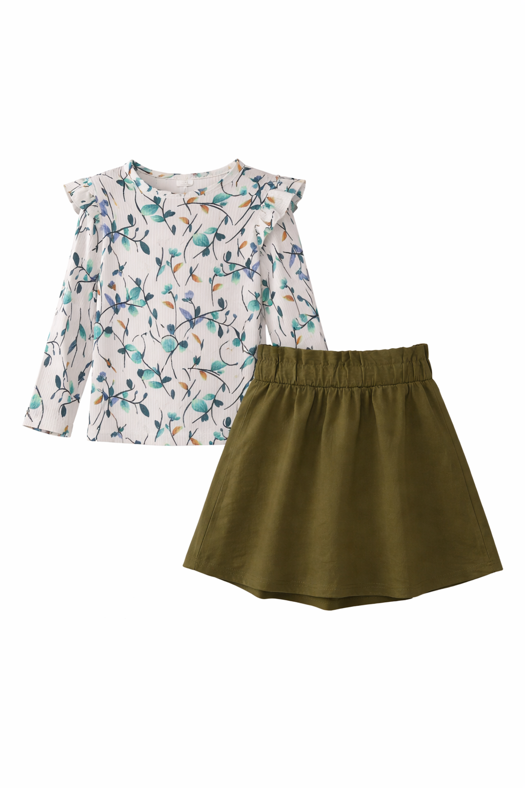 طقم بناتي قطعتين توب مشجر وتنورة زيتية – ملابس أطفال خروج صيفيةGirls Floral Ribbed Set | سوت بناتي