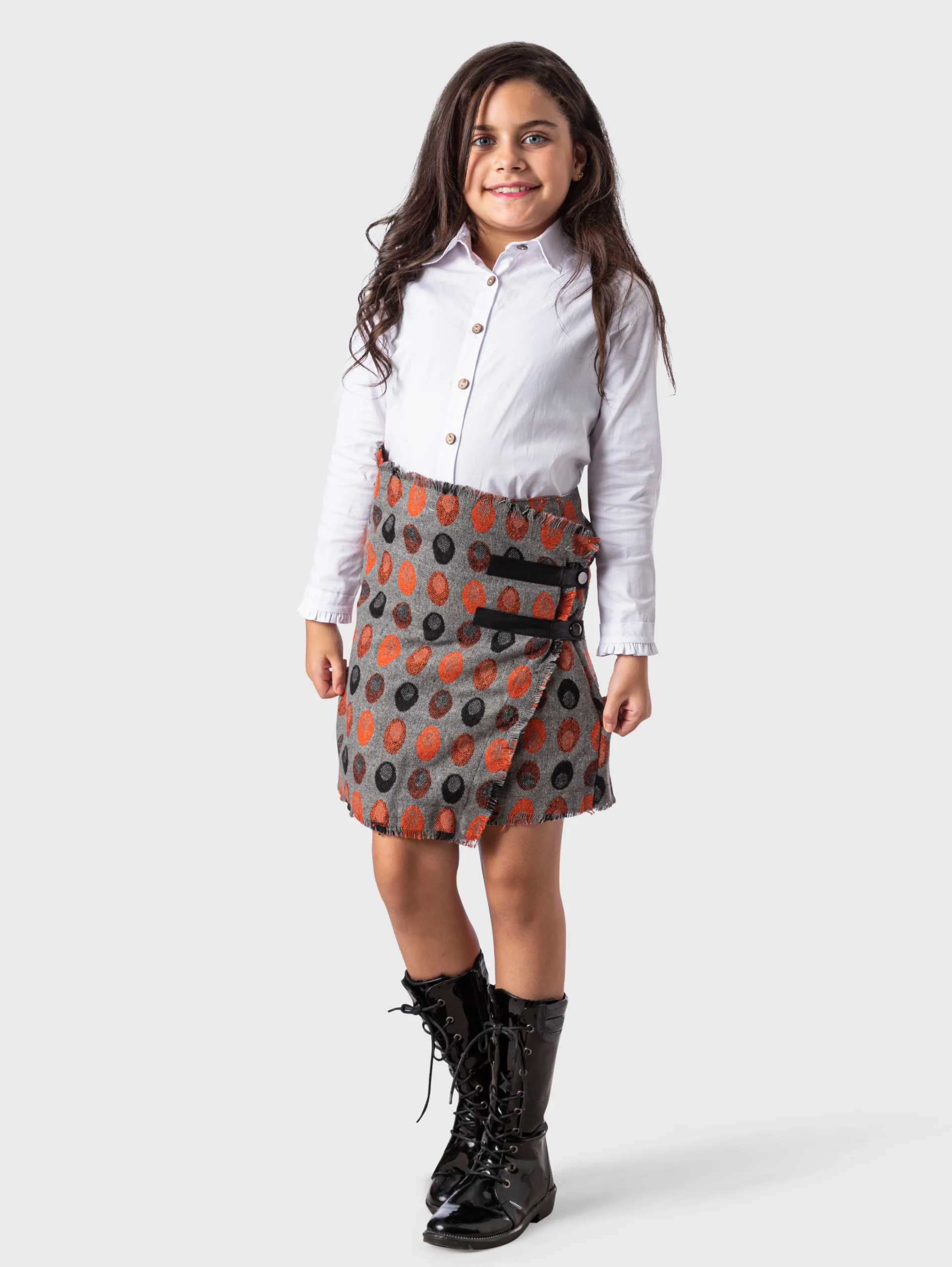 التنورة مصنوعة من تريكو صوفي أو جوخ ثقيل. هذه الخامة تضمن لطفلتك الدفء والراحة. التصميم هو تنورة لف (Wrap Skirt) أنيقة. اللون الأساسي هو الرمادي الفاتح الهادئ. تتميز التنورة بطبعة بقع بيضاوية باللونين البرتقالي والأسود. الحافة السفلية للسكيرت تأتي مهدبة (Fringed Hem). تتضمن تفاصيل شريطين أسودين مع أزرار زخرفية.