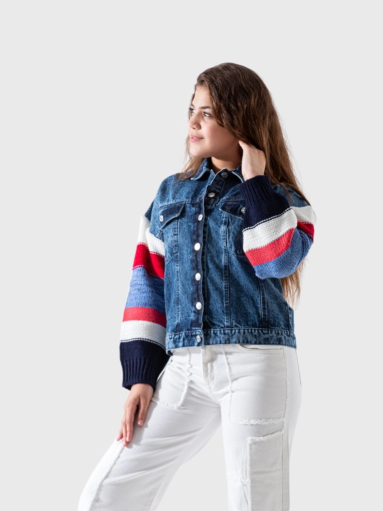 يتميز الجاكيت بقصة جاكيت الجينز الكلاسيكي بجسم من الدينيم الأزرق. النقطة المحورية في التصميم هي الأكمام، المصنوعة من نسيج صوفي محبوك وسميك. الأكمام مخططة بخطوط أفقية جريئة تجمع بين ألوان الكحلي، الأحمر، والأبيض. هذا المزيج يوفر دفئاً إضافياً ويضيف لمسة رياضية عصرية. الجاكيت مزود بأزرار أمامية وجيوب على الصدر.