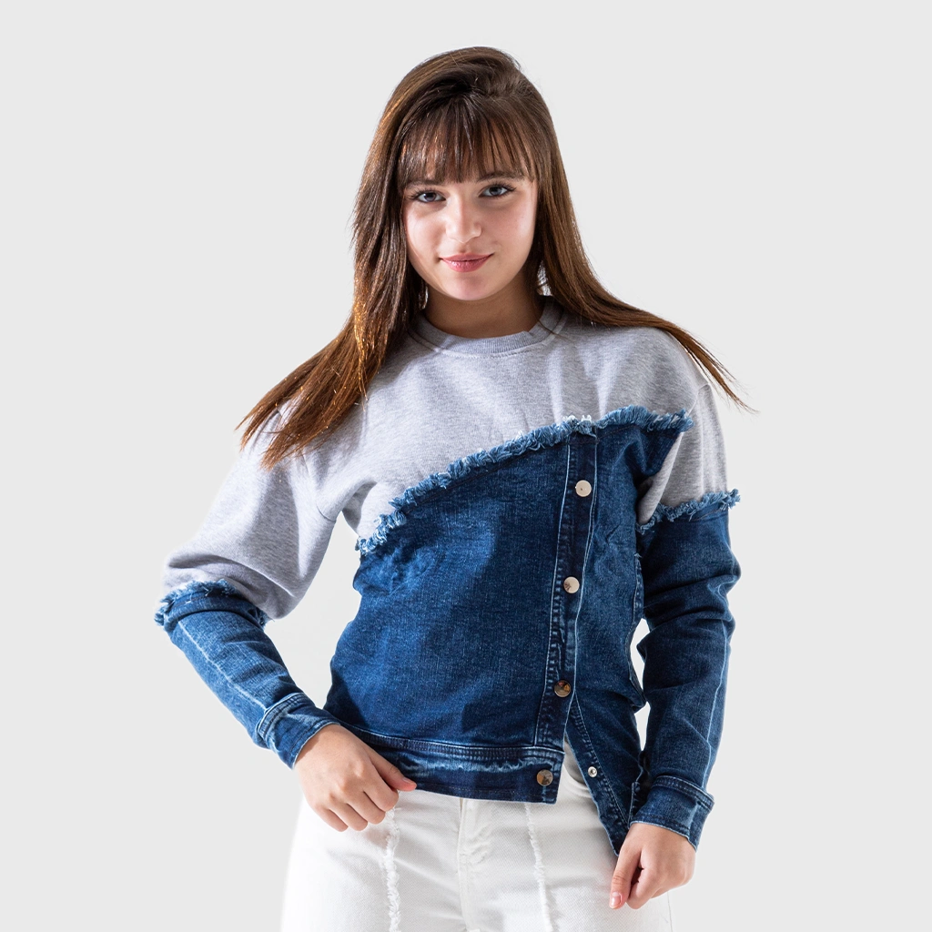 سويت شيرت بناتي شتوي بتصميم هجين يجمع بين النسيج القطني الرمادي والدينيم الأزرق. يتميز بحواف مهترئة وتفاصيل أزرار. قطعة فريدة وعصرية لـ ملابس البنات (6-10 سنوات).