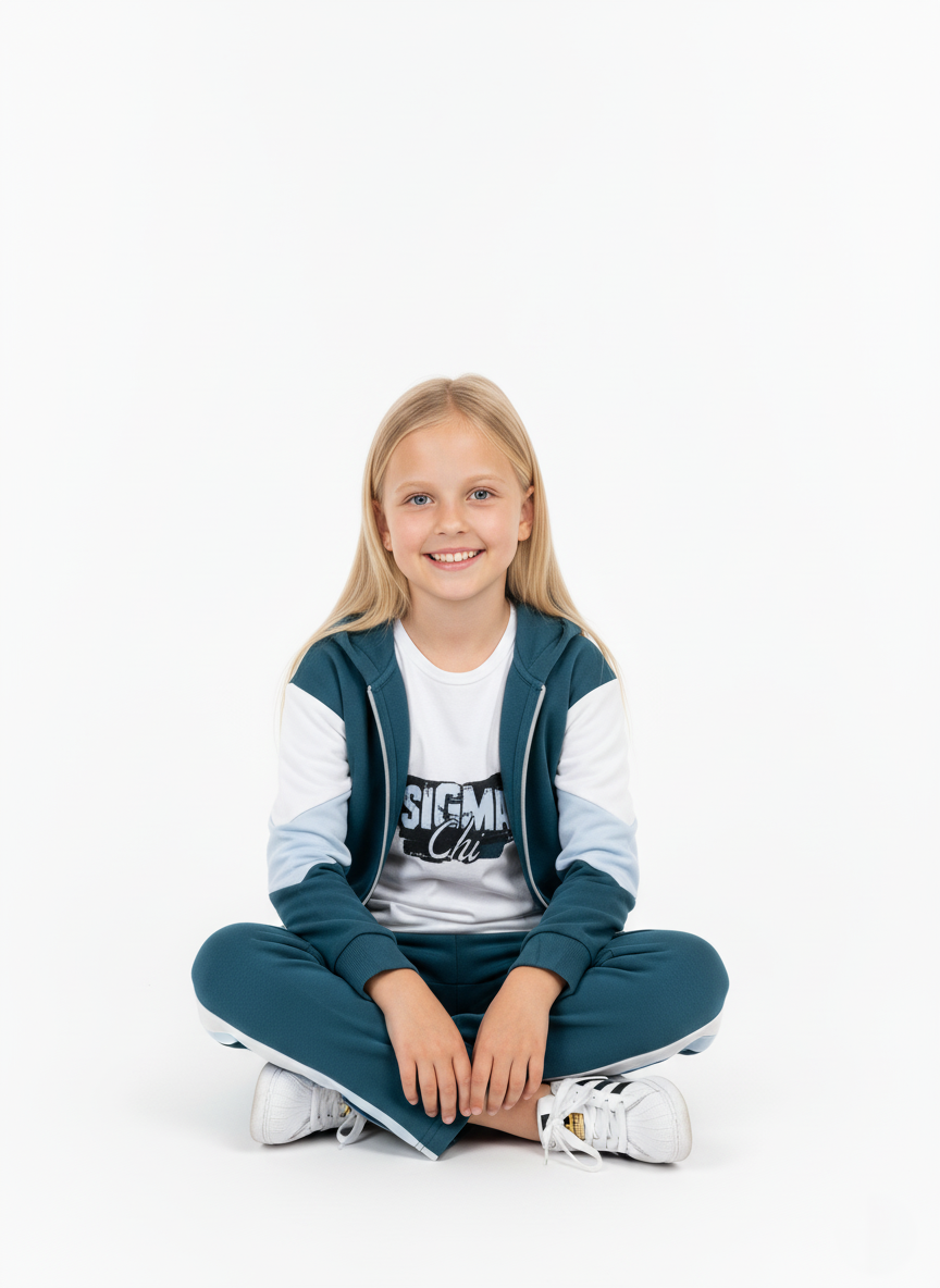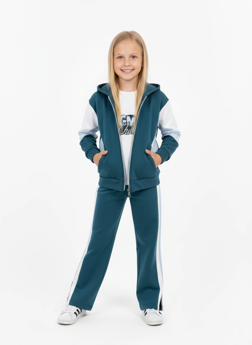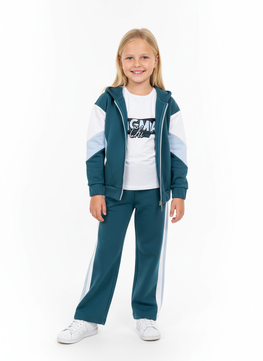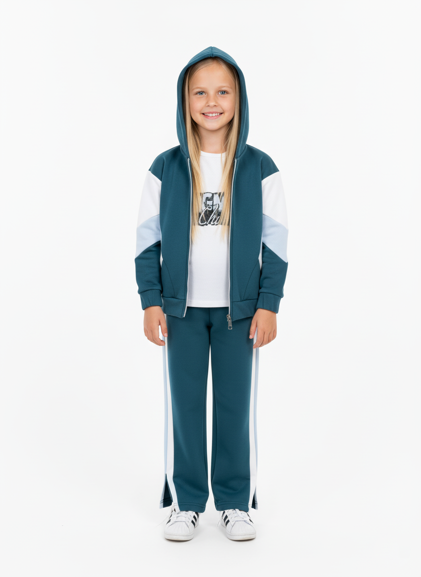 يتميز السوت بتصميم رياضي عصري يجمع بين اللون الزيتي الراقي وتفاصيل باللون الأبيض واللبني الفاتح. يناسب هذا الطقم الـ بنات من 2 لـ 6 سنوات في الخروجات اليومية والنادي.