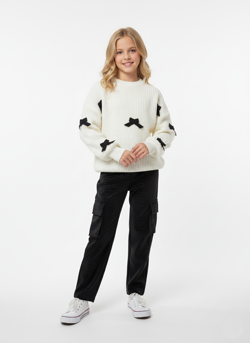 ملابس أطفال شتوية بتصميم يجنن ومودرن من براند A&A لكل البنات اللي بيحبوا الأناقة. البلوفر تريكو ناعم جداً بلون أبيض، ومزين بفيونكات سوداء بارزة بتضيف لمسة رقة وفخامة. الطقم ده مثالي لفئة بناتى كبير لأنه بيجمع بين الراحة والشكل الشيك جداً.