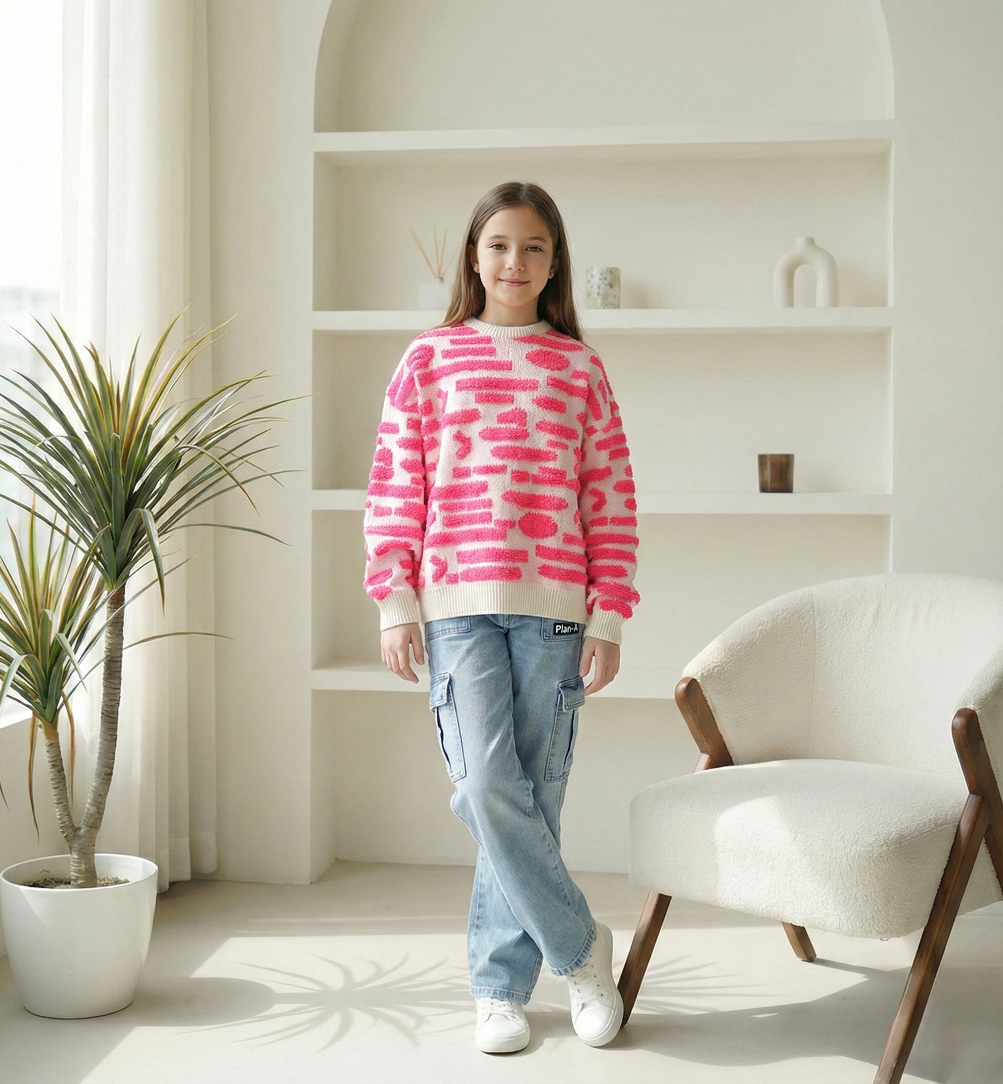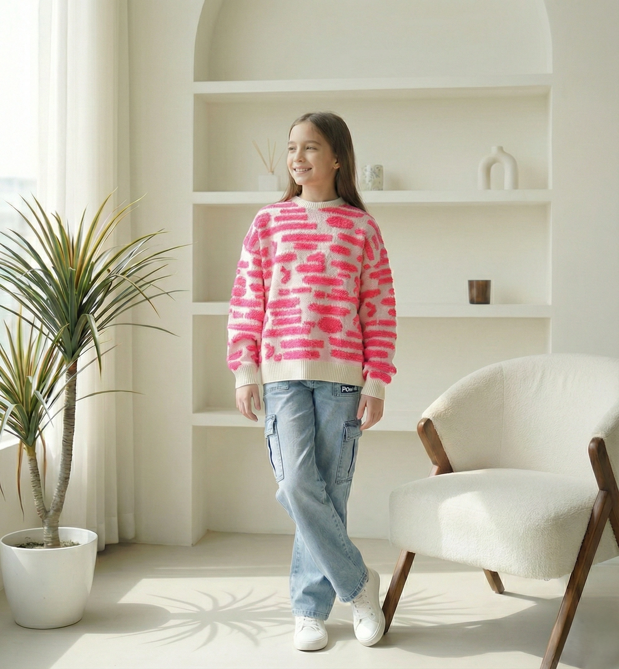 بلوفر ملابس أطفال بناتي تريكو بتصميم عصري وألوان فوشيا مبهجة. يناسب القطعة بنات من 8 لـ 16 سنة وتوفر لهن الدفء والأناقة في شتاء 2026. اطلبيه الآن واحصلي على التميز من A&A.