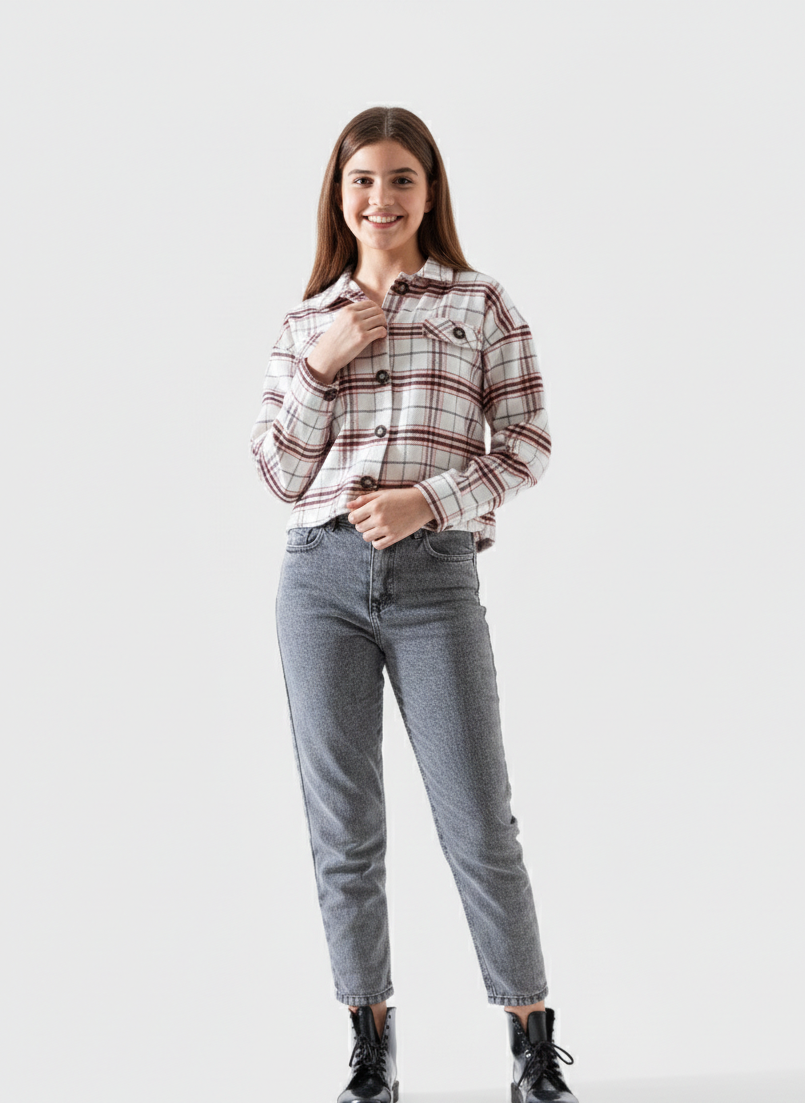 ملابس أطفال بتصميم يجمع بين الدفء والشياكة، الشميز الكاروهات هو القطعة اللي متبطلش موضة أبدًا في دولاب بنوتك. الشميز بيجي بخامة جوخ خفيفة وناعمة جدًا، مثالية لجو الخريف المتقلب وعشان تضمن لبنوتك الراحة طول اليوم. التصميم بيتميز بألوان راقية تمزج بين الأبيض والروز مع خطوط سوداء رقيقة، وقصة “أوفر سايز” عصرية بتليق على كل أشكال الجسم. القطعة دي من براند A&A بتناسب جدًا فئة بناتى كبير، وبتقدر البنوتة تنسقها مع بنطلون جينز رمادي زي اللي في الصورة أو أسود لطلة كاجوال مميزة في الدروس أو الخروجات.