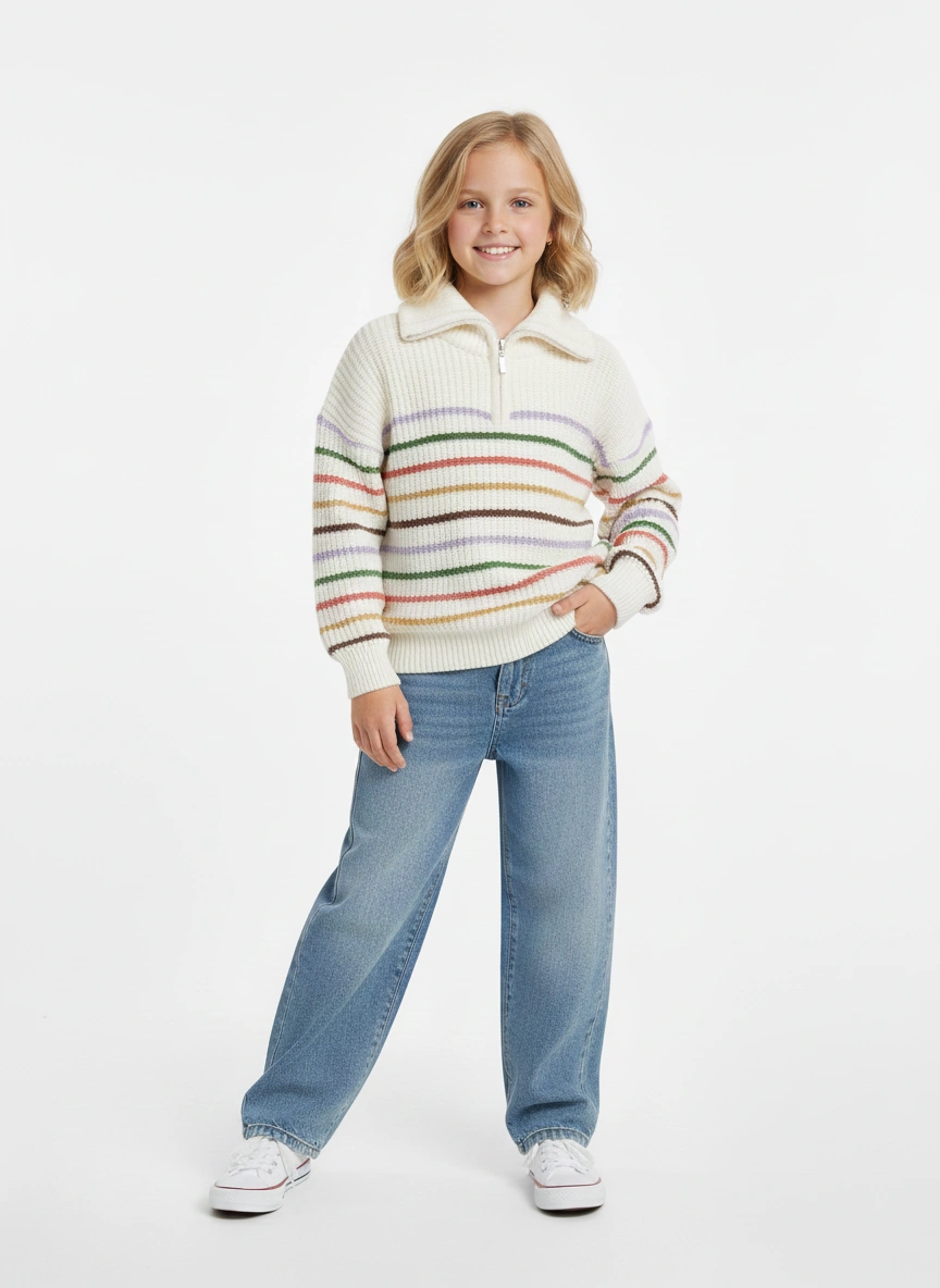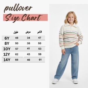 تُعد هذه الكنزة الصوفية المحبوكة إضافة رائعة لمجموعة ملابس بنات الشتوية، حيث تجمع بين الدفء والأناقة العصرية. تتميز الكنزة بلونها الأبيض الكريمي الأساسي مع خطوط أفقية متعددة الألوان (بما في ذلك البني والأخضر والأحمر) التي تضفي حيوية ومرحاً على الإطلالة. هذه الكنزة الشتوية الثقيلة مناسبة لمقاسات البنات الكبيرة (من 8 لـ 16 سنة).
