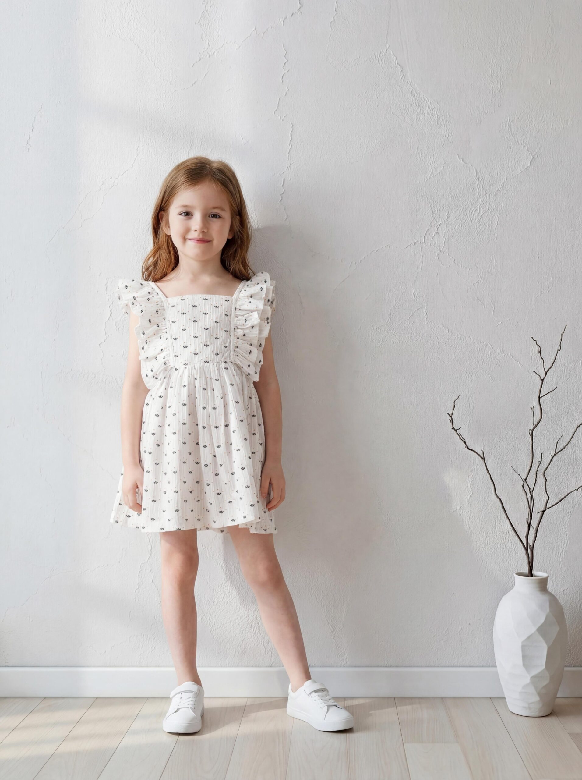 ملابس أطفال صيفية غاية في الرقة والجمال تقدمها لكِ علامة A&A الفاخرة لتناسب طفلتك المدللة. يتميز هذا الفستان الأبيض بنقشات زهور صغيرة وهادئة تمنح طفلتك إطلالة ملائكية منعشة في أيام الصيف. صممنا الموديل بكرانيش جانبية (Ruffles) واسعة تبدأ من الكتف وتصل للخصر لتضيف لمسة من الفخامة والتميز. نستخدم في هذا الفستان أرقى أنواع القطن الطبيعي الذي يحمي بشرة بنات من 2 لـ 6 سنوات ويسمح لها بالحركة بحرية. تضمن القصة المريحة والخامة الباردة شعور طفلتك بالانتعاش الدائم أثناء الخروجات النهارية أو المناسبات الخاصة.