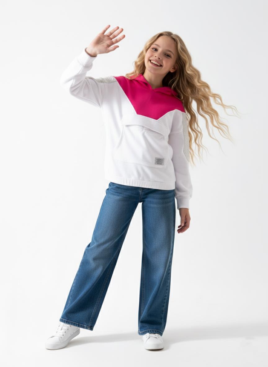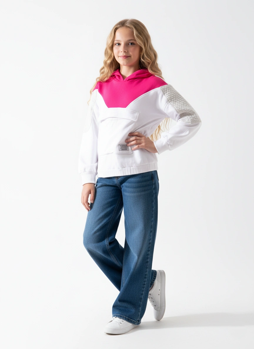 واكبي أحدث صيحات الموضة الشتوية مع هذا السويت شيرت بقلنسوة (هودي) المتميز بتصميم الـ Color Block الأنيق. يتميز السويت شيرت بتداخل لوني جريء بين الأبيض الناصع والوردي الفوشيا الزاهي عند الياقة والقلنسوة. هذه القطعة مثالية لمقاسات البنات الكبيرة واليافعات (المقاسات المتاحة عادةً: 8، 10، 12، 14، 16 سنة).