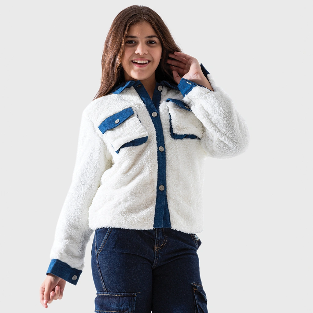 الجاكيت مصنوع بالكامل من فرو الشيربا (Teddy Fleece) الناعم والسميك باللون الأبيض الكريمي. هذه الخامة توفر عزلاً حرارياً ممتازاً لشتاء دافئ. يتميز بتفاصيل متباينة من الدينيم (الجينز) الأزرق الداكن. تظهر هذه التفاصيل على الياقة، الأكمام، حواف الأزرار، وحواف الجيوب الأمامية. يأتي بقصة مريحة وأزرار أمامية لسهولة الارتداء.