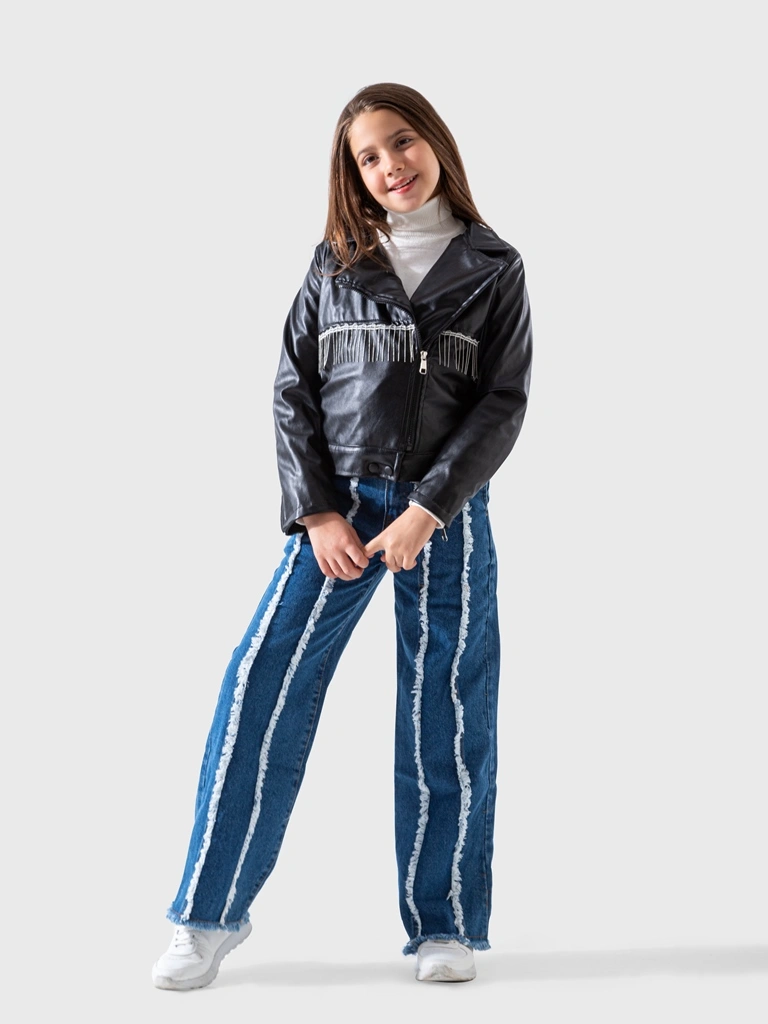 ملابس أطفال بنات شتوية؛ جاكيت بايكر جلد صناعي أسود لامع بشراشيب فضية أنيقة. تصميم عصري ومميز بياقة عريضة وسحاب مائل. مثالي للخروج المميز ومناسب لمقاسات 8-10 سنوات. قطعة أساسية تمنح طفلتك المظهر الجذاب والساحر.