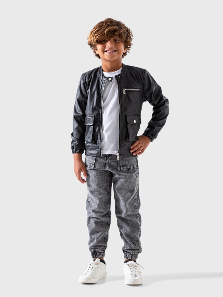 ملابس أطفال أولادي شتوية؛ جاكيت جلد أسود بتصميم “بومبر” عصري يمنح طفلكِ إطلالة جريئة ومميزة. هذا الجاكيت من A&A هو القطعة المثالية لإضافة لمسة ستايل مميزة على ملابس طفلك في فصل الشتاء. الخامة من الجلد الصناعي عالي الجودة الذي يحافظ على الدفء ويقاوم الرياح الخفيفة.