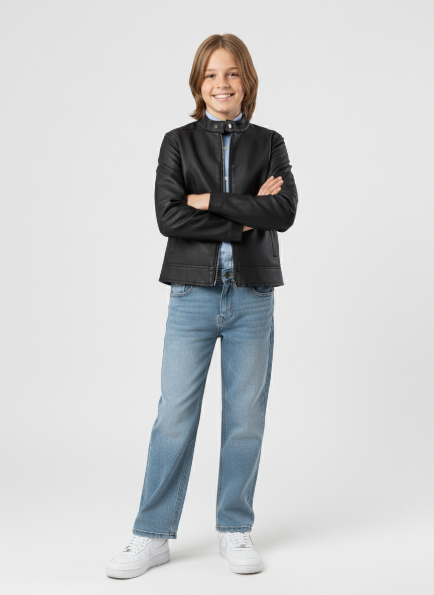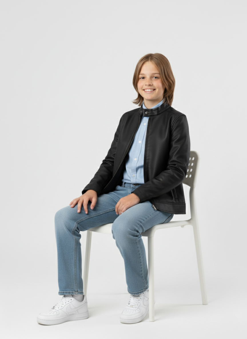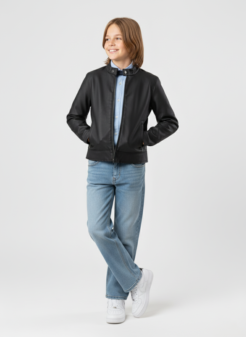 ملابس أطفال شتوية فخمة تقدمها لكِ علامة A&A بتصميم عصري يخطف الأنظار. هذا الجاكيت الجلد الأسود يمنح طفلك إطلالة “الروك ستار” الأنيقة مع الحفاظ على الدفء الكامل. صنعنا الجاكيت من جلد صناعي عالي الجودة بملمس ناع يشبه الجلد الطبيعي تمامًا. التصميم يتميز بياقة قصيرة (Mandarin collar) وسحاب أمامي متين يسهل على طفلك ارتداءه بنفسه. البطانة الداخلية ناعمة جدًا ومريحة لبشرة الأطفال الحساسة ولا تسبب أي ضيق أثناء الحركة.