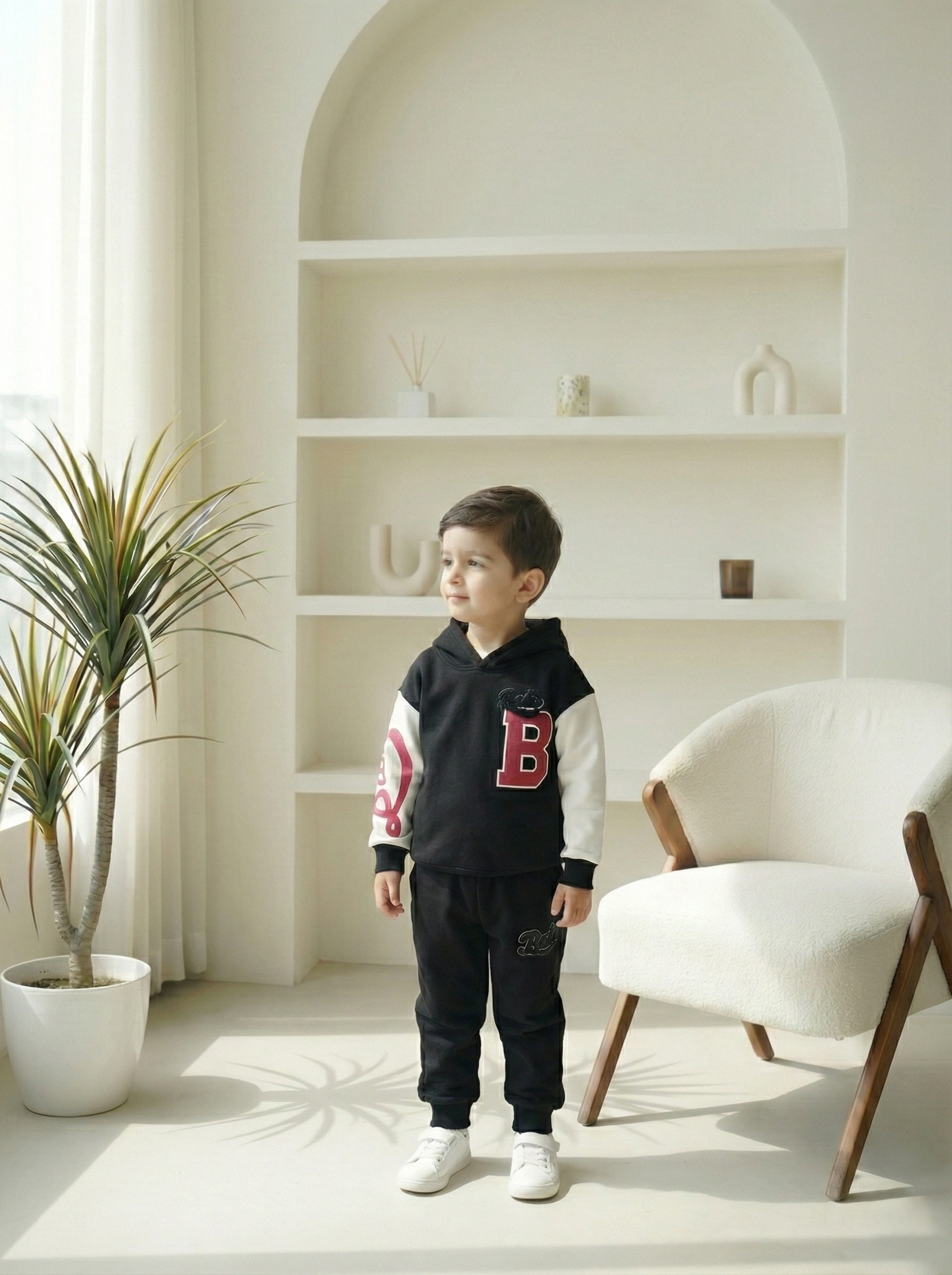 ملابس أطفال شتوية بتصميم رياضي جريء تقدمها لكي علامة A&A لراحة طفلك اليومية. السوت يتكون من قطعتين: هودي بقلنسوة وبنطلون رياضي مريح بلون أسود فخم. استخدمنا خامة الميلتون المبطنة التي تضمن الدفء التام في أبرد الأيام. يتميز التصميم بشعار حرف “B” وحروف كلمة “Bulls” باللون الأحمر الجذاب على الأكمام. التباين بين اللونين الأسود والأبيض في الأكمام يمنح الطقم مظهراً عصرياً ومميزاً.
