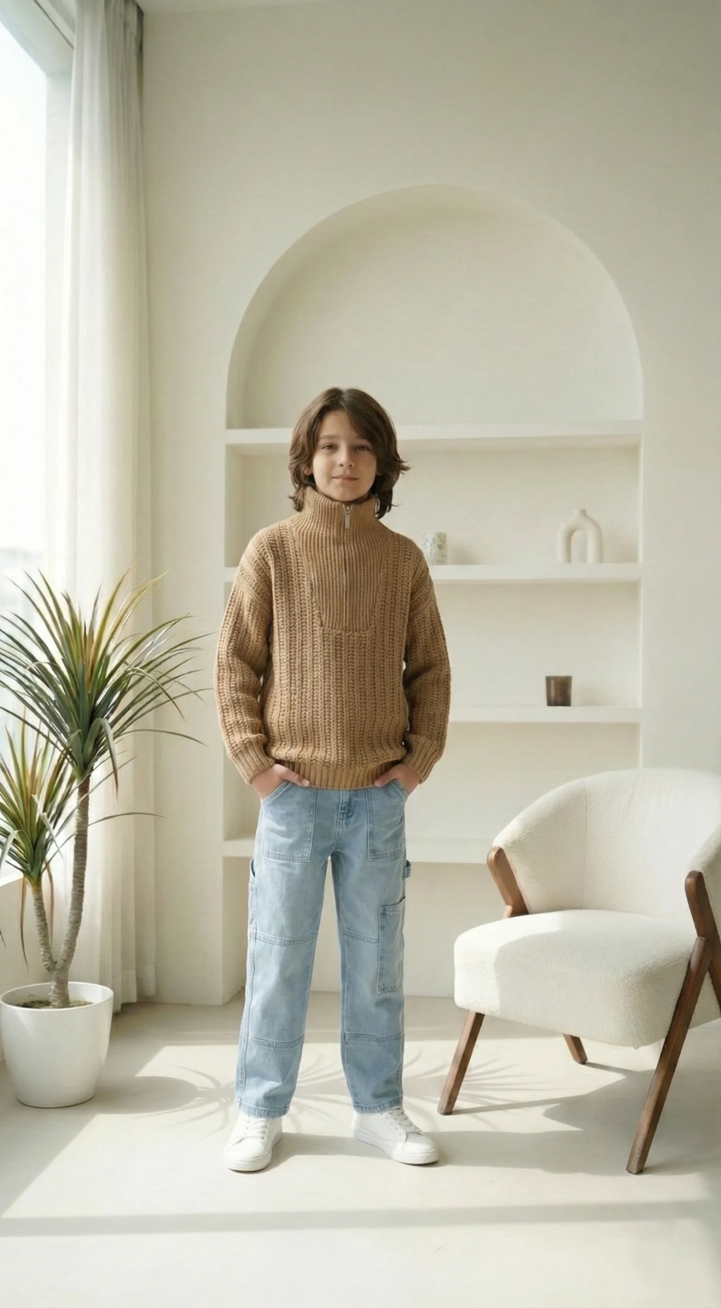 ملابس أطفال شتوية فاخرة تقدمها لكي A&A بتصميم كلاسيكي راقٍ. يتميز البلوفر بلونه الهافان (Camel) الدافئ الذي يمنح طفلك إطلالة فخمة. صممنا هذه القطعة من خامة التريكو المضلع (Ribbed Knit) عالية الجودة لضمان تدفئة مثالية. يناسب هذا الموديل فئة أولادى كبير الباحثين عن الأناقة والراحة. يحتوي البلوفر على سحاب علوي عصري يسمح بتعديل الياقة بسهولة. تضمن الخامة المرنة لطفلك حرية الحركة التامة أثناء النشاط اليومي والخروجات.