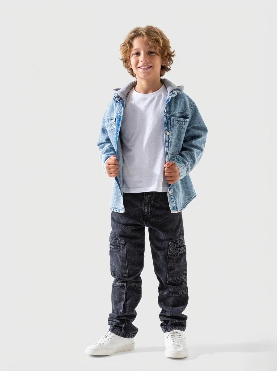 ملابس أطفال شتوية بتقدمها A&A لكل أم بتدور على التميز لابنها. الجاكيت الجينز ده بقطعة الهودي الرمادي بيجمع بين الأناقة والتدفئة المثالية. القماش الجينز عالي الجودة يضمن لابنك حرية الحركة طول اليوم. التصميم عصري جداً ومناسب لستايل أولادى كبير المحبب للجميع.
