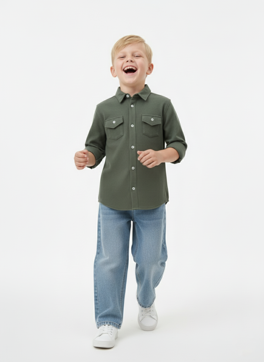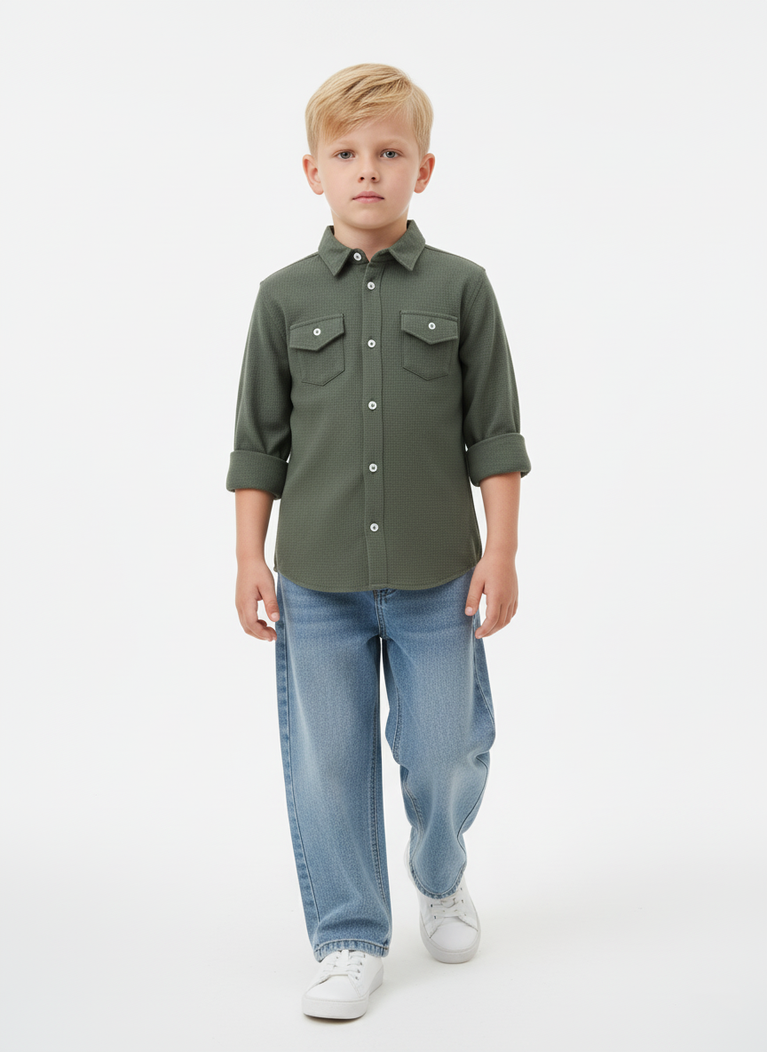 قميص أولادي أخضر زيتوني بجيوب مزدوجة وجينز أزرق – ملابس أطفال خروج شيك وعصرية 2026.Cotton Shirt for Boys | قميص أولادي