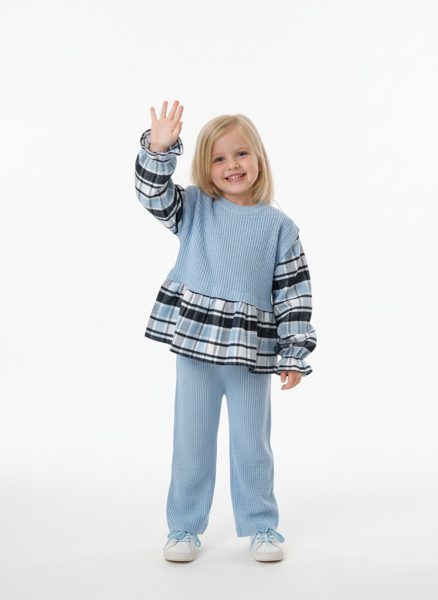 سوت تريكو بنات أزرق كاروهات – ملابس أطفال بنات شتوية أنيقة 2025Girls Knit Two-Piece Outfit | سوت بناتي