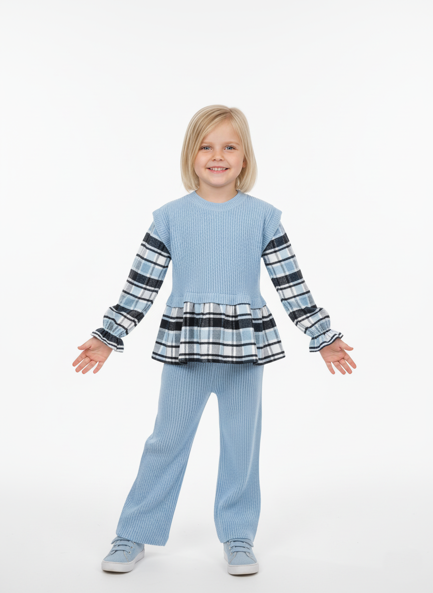 سوت شتوي بناتي تريكو دافئ باللون الأزرق السماوي. يتميز ببلوزة بقصة البيبلوم (Peplum) وتفاصيل كاروهات. طقم أنيق وفاخر لـ بيبي بناتى لموسم الشتاء.