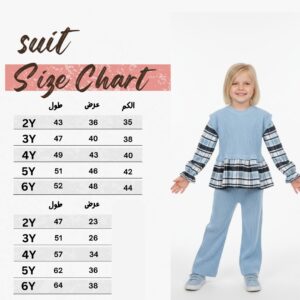 يتميز السوت بتفاصيل كاروهات مخططة بالرمادي والأسود والأبيض على الأكمام وأسفل البلوزة، مما يخلق تبايناً جذاباً مع اللون الأزرق. الخامة التريكو السميكة تضمن لطفلتك الدفء الكامل والراحة في أيام الشتاء الباردة، مما يجعله مثالياً للمناسبات العائلية أو أيام المدرسة.