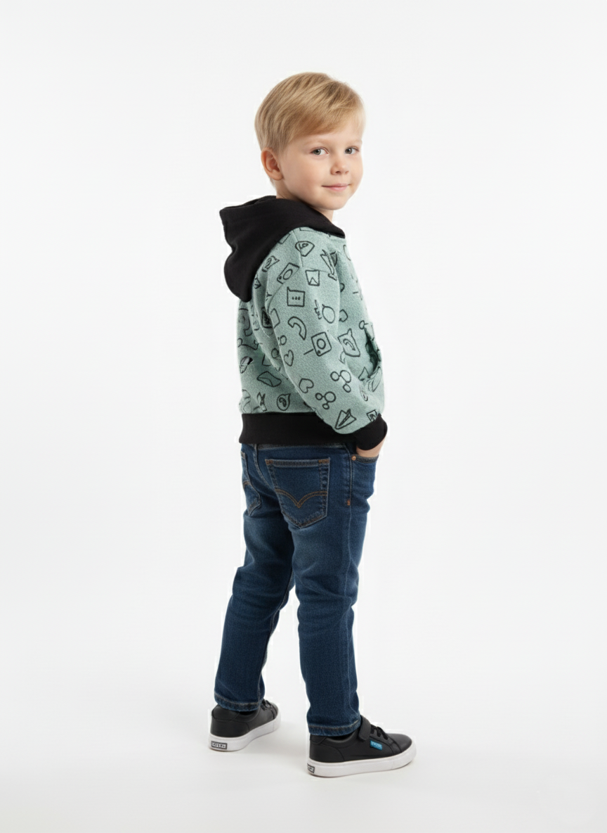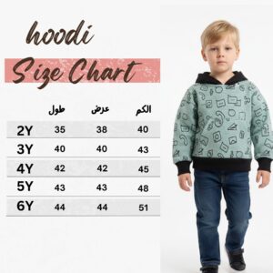 ملابس أطفال أولادي تجمع بين الدفء، الأناقة العصرية، والراحة المطلقة. سويت شيرت هودي بتصميم حصري يتميز بخامة الميلتون القطنية الناعمة والدافئة التي تحافظ على درجة حرارة طفلك دون أن تزعجه. إنه مثالي لأيام الخريف والشتاء المعتدلة. تصميم البلوفر الواسع يضمن لطفلك سهولة الحركة واللعب، والألوان الزاهية مع الطباعة الجرافيكية العصرية (Mint Green & Black) تجعل طفلك محور الأناقة. تصميم الهودي والكُم الأسود يضيف لمسة عصرية جذابة. الأمهات يوصين به لجودته الفائقة وقدرته على تحمل الغسيل المتكرر.