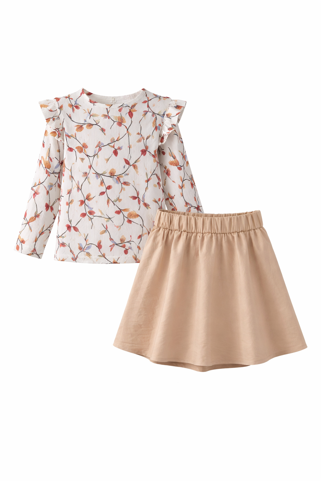 ملابس أطفال صيفية مريحة جداً لفتاتك الصغيرة من براند A&A الفاخر. يتكون الطقم من قطعتين، بلوزة رقيقة بأكمام طويلة مزينة بكشكشة عند الكتفين وجيبة واسعة بلون بيج هادئ. اخترنا القماش القطني الناعم لضمان أقصى راحة لبشرة طفلتك في بناتى بيبى. التصميم المشجر بنقوش أوراق الشجر الخريفية الملونة يضيف لمسة من الرقي والأناقة على إطلالتها اليومية.