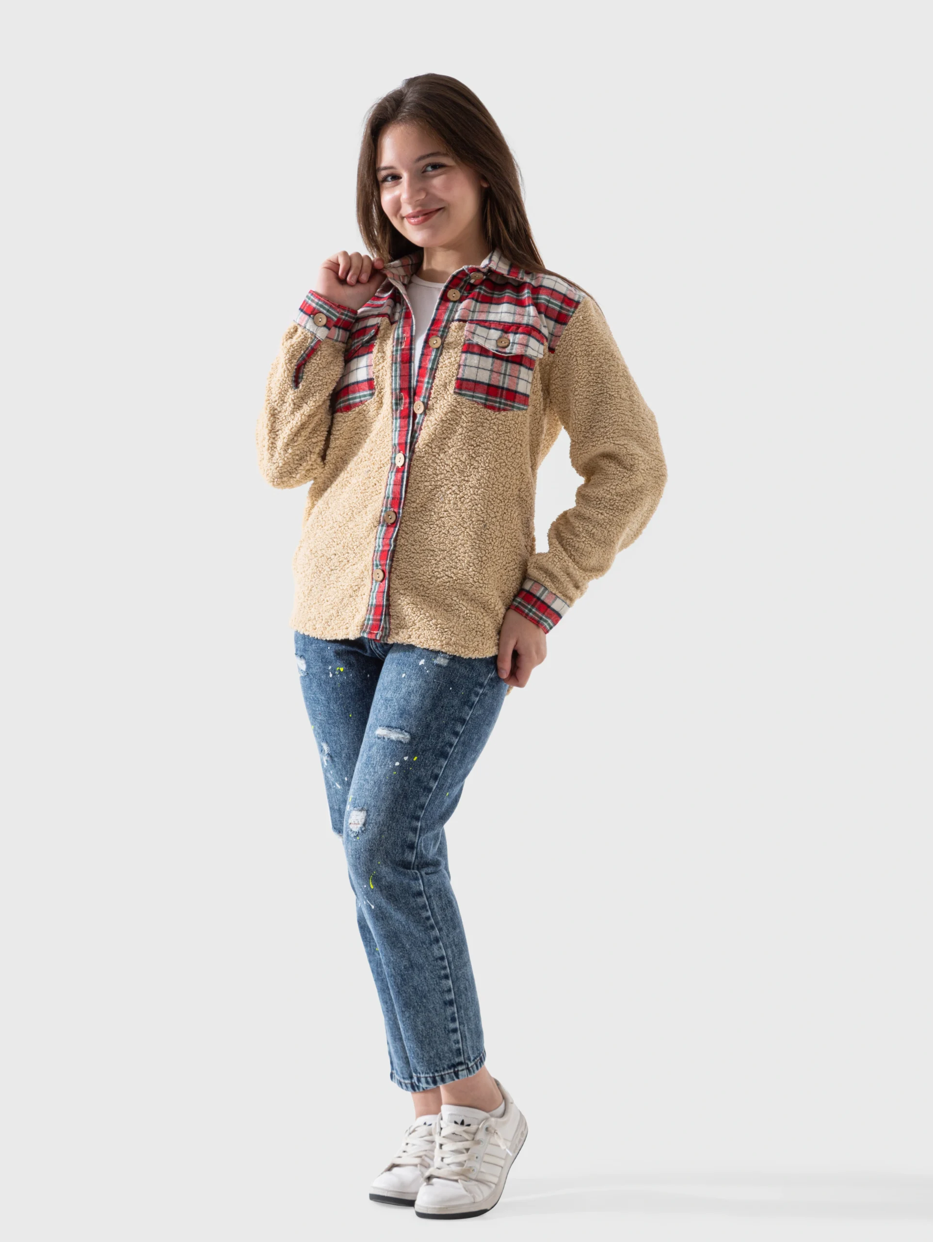 شميز جاكيت فرو بناتي أبيض بتطعيمات كاروهات – شميز فرو شتوي بناتيShirt Jacket Plaid Trim for Girls | شيرت جاكيت