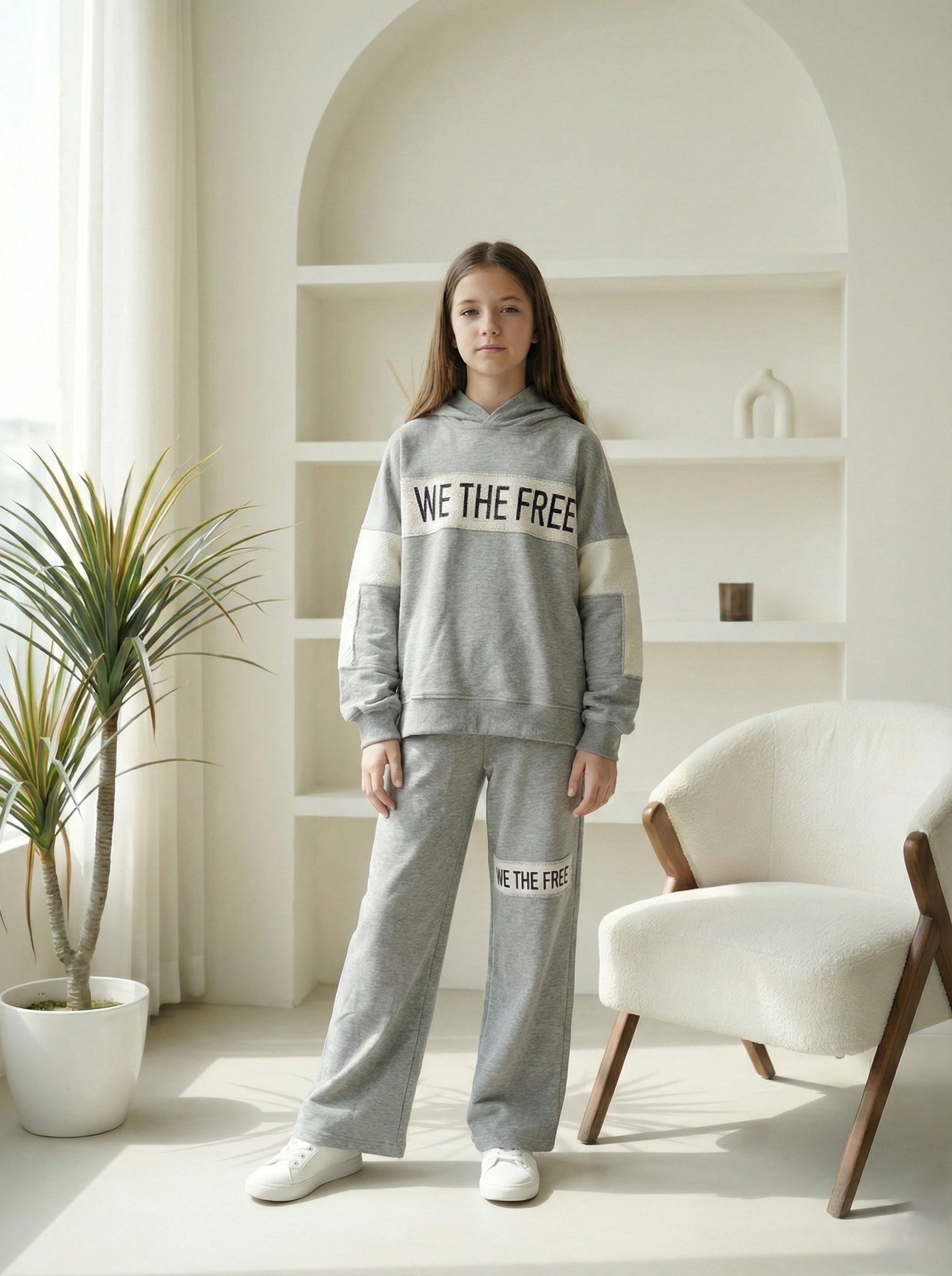 ملابس أطفال خريفية من A&A بتصميم عصري. الطقم يتكون من هوديي واسع ومريح. يضم أيضاً بنطلون بوي فريند عملي جداً. استخدمنا خامة ميلتون ناعمة وعالية الجودة. التصميم الرمادي يناسب خروجات النادي والدروس اليومية. يوفر الطقم حرية كاملة لحركة بنتك. الطبعة الأمامية “We The Free” تعطي لمسة فخامة.