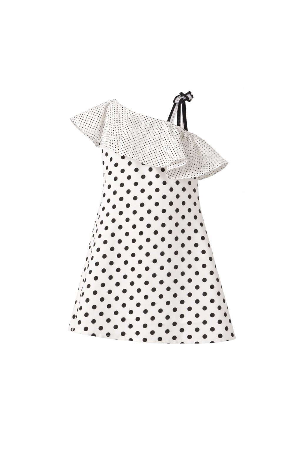 ملابس أطفال صيفية تمنح ابنتك إطلالة أيقونية مفعمة بالحيوية من تشكيلة A&A. يتميز هذا الفستان بنقشة المنقط (Polka Dot) الكلاسيكية باللونين الأبيض والأسود. صممنا القطعة بقصة “أوف شولدر” (Off-Shoulder) بكتف واحد مزين بكرانيش رقيقة تضفي لمسة من الأنوثة. يناسب هذا الموديل بناتى بيبى الذين يعشقون التميز في الحفلات والمناسبات الصيفية المبهجة.