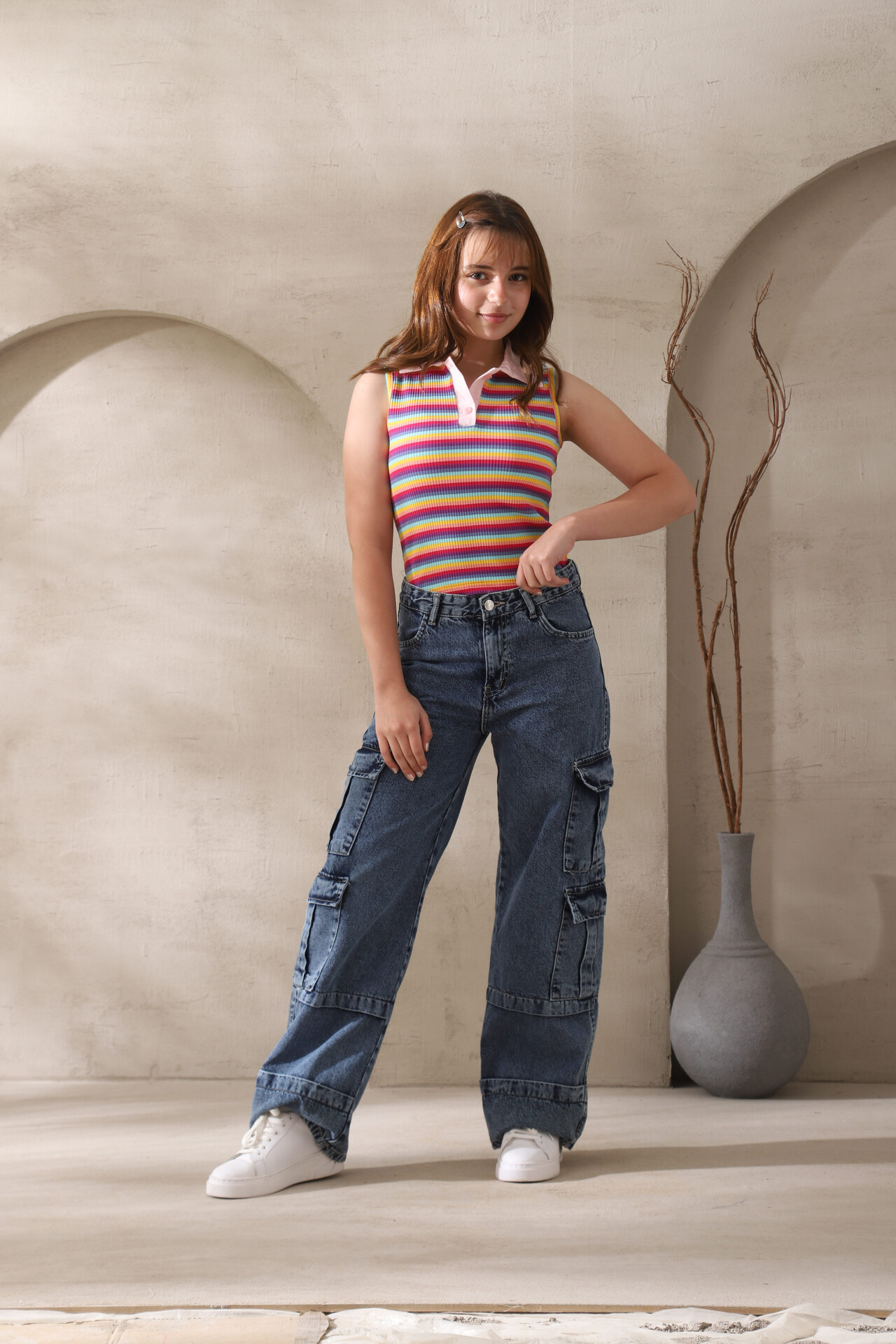 ملابس أطفال صيفية مبهجة تخطف الأنظار بتصميم ألوان الطيف من براند A&A. التيشيرت يأتي بستايل “بولو” بدون أكمام (Sleeveless) مع ياقة أنيقة باللون الوردي الفاتح، مما يمنح طفلتك إطلالة رياضية وأنثوية في وقت واحد. المنتج مصنوع من قطن مطاطي (Ribbed Cotton) ناعم جداً لضمان الراحة التامة لفئة بناتى كبير وللصغيرات أيضاً. الخطوط العرضية الملونة تعطي طاقة وحيوية تناسب أجواء المصايف والنوادي والخروجات الصيفية. تتميز ملابس أطفال متجرنا بجودة الخيوط وثبات الألوان التي لا تبهت مع الغسيل المتكرر. يمكنك تنسيق التيشيرت بسهولة مع بنطلون جينز كارغو واسع أو شورت كاجوال لإكمال اللوك العصري. ننصح بغسل القطعة بماء بارد للحفاظ على مرونة القماش القطني وزهوة ألوان قوس قزح. اختاري لطفلتك الأفضل لتتألق في صيف 2025 بقطعة فريدة تعكس ذوقك الرفيع.