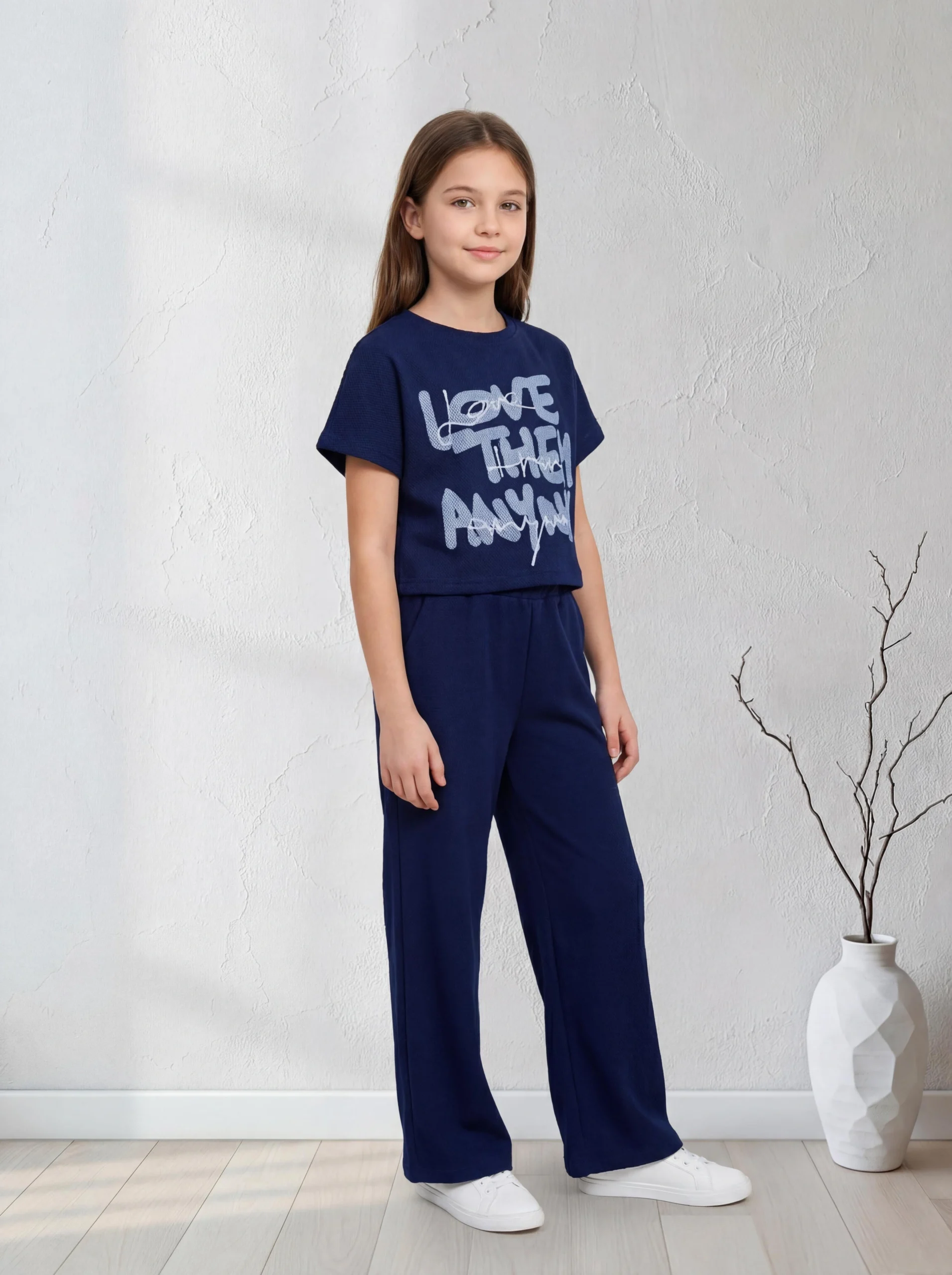 ملابس أطفال صيفية قطعتين (تيشيرت وبنطلون واسع) بلون كحلي فخم. طقم كاجوال مريح جداً يناسب بنات من 7 لـ 16 سنة. تألقي بجودة براند A&A الفاخرة الآن.