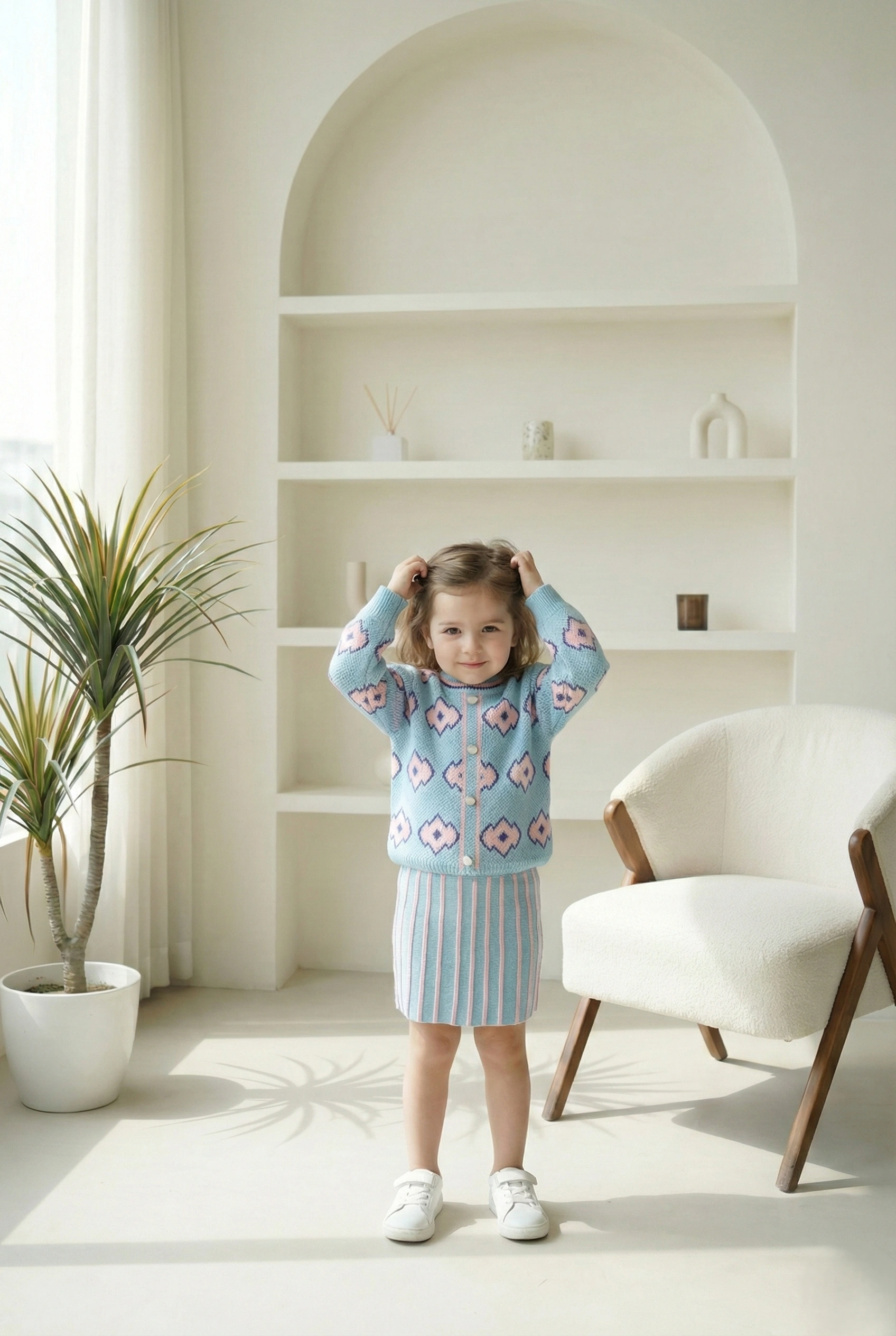 ملابس أطفال شتوية راقية تقدمها لكي علامة A&A بتصميم كلاسيكي دافء. السوت يتكون من قطعتين: كارديجان بأزرار وجيبة قصيرة متناسقة. استخدمنا خامة تريكو ناعمة تحافظ على حرارة جسم طفلتك. اللون اللبني مع النقشات الوردي يمنحها إطلالة الأميرات. التصميم يناسب الزيارات العائلية والمناسبات الخاصة في الشتاء.