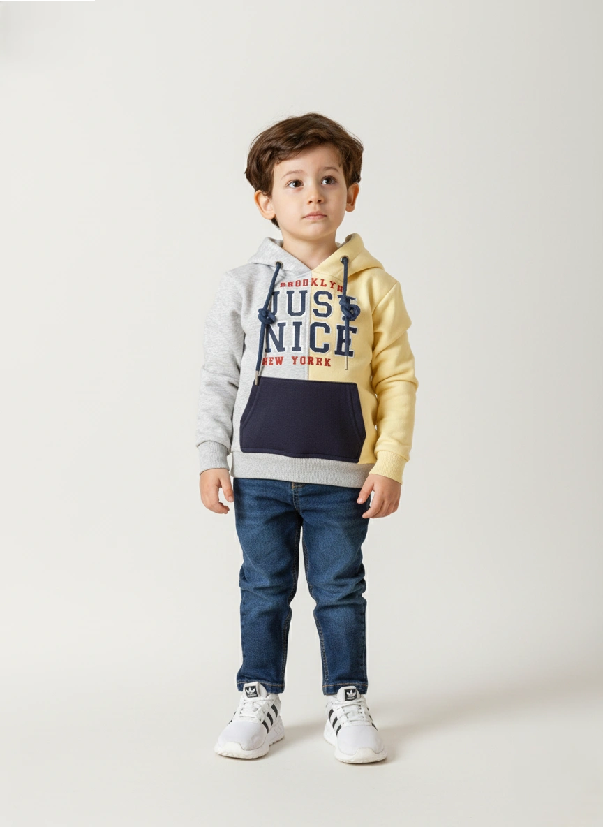 التصميم “Color Block” يجمع بين الألوان الجذابة (الرمادي، الأصفر، الكحلي) مع طباعة “JUST NICE” العصرية، مما يضيف لمسة حيوية ومرحة لإطلالة طفلك. قصّة السويت شيرت مريحة جدًا وتضمن حرية الحركة الكاملة أثناء اللعب والنشاط اليومي. يتميز بوجود غطاء للرأس وجيب أمامي يوفر الدفء الإضافي.