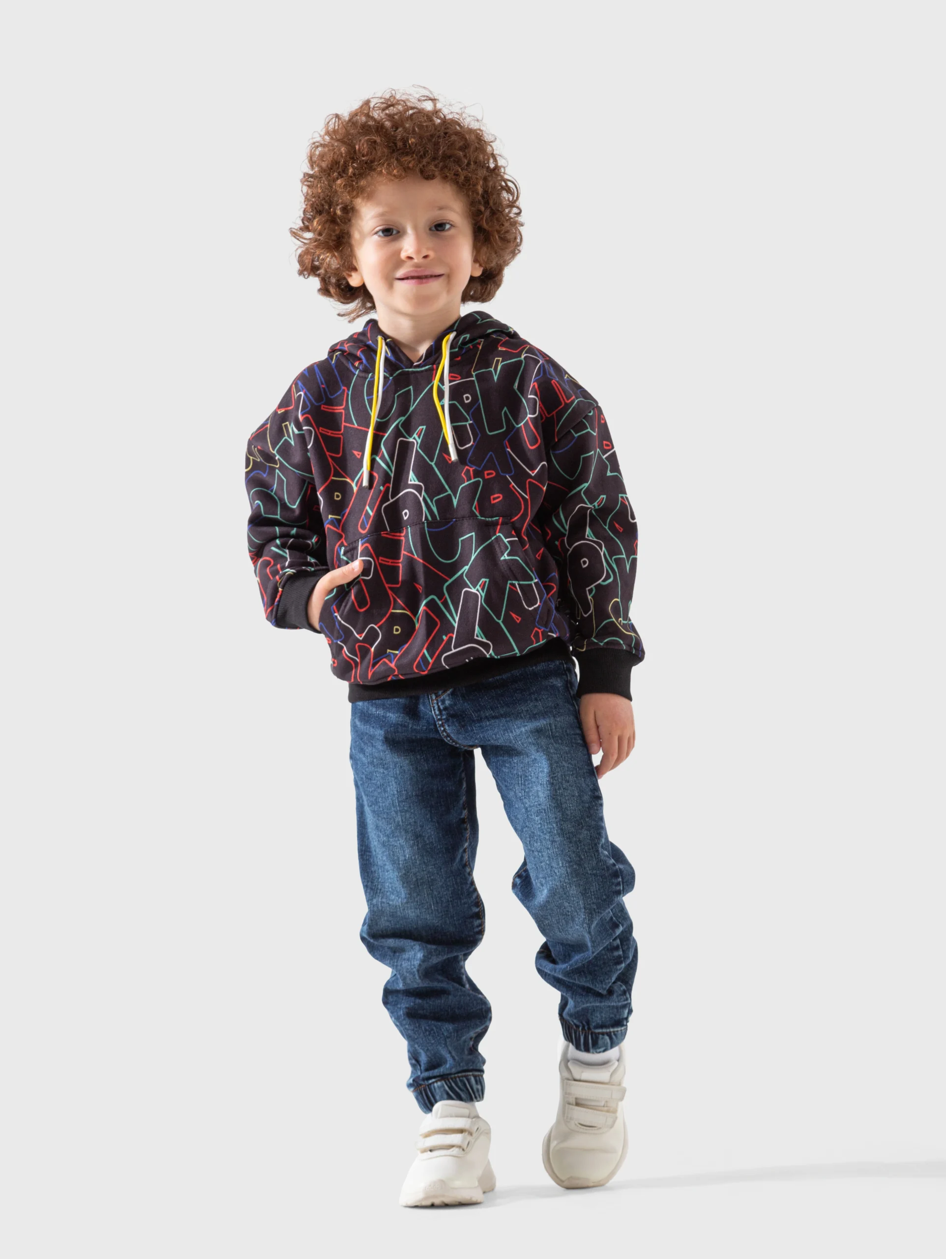 اللون الأسود للخلفية يبرز الطباعة الجرافيكية بخطوط النيون الفسفورية الملونة، مما يمنح طفلك مظهراً فنياً وحيوياً. القصّة المريحة للهودي وغطاء الرأس يضمنان لطفلك سهولة الحركة الكاملة أثناء اللعب. الأربطة الصفراء النيون وغطاء الرأس يضيفان لمسة عصرية. الهودي مزود بجيب أمامي متصل (كانجارو) يمكنك استخدامه لحفظ اليدين.