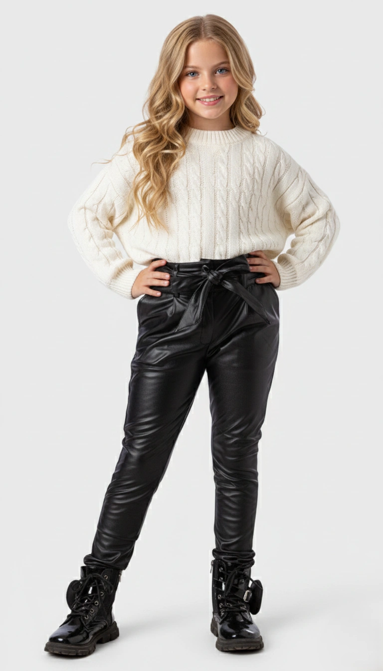 ملابس أطفال شتوية تعكس الفخامة والجمال من براند A&A. نقدم لكِ بنطلون جلد بناتي أنيق باللون الأسود اللامع. يتميز التصميم بخصر مرتفع مزين بحزام “فيونكة” يمنح ابنتك مظهرًا عصريًا وجذابًا. الخامة الجلدية ناعمة جدًا من الداخل لتوفير الدفء والراحة طوال اليوم. هذا الموديل مثالي لـ بناتى كبير ويناسب الخروجات الشتوية والمناسبات الخاصة.