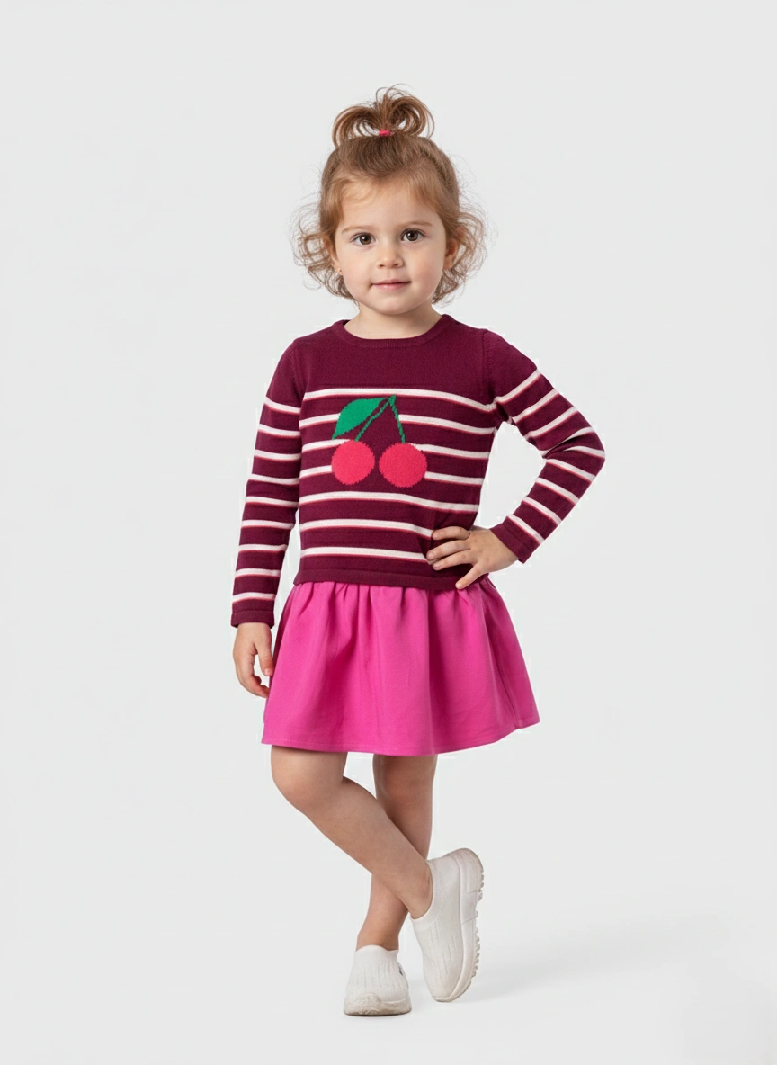 البلوزة العلوية: محاكة من نسيج صوفي/قطني ناعم، ومخططة باللون العنابي والأبيض، وتتميز بتطريز أو زخرفة حبة الكرز (Cherry) البارزة والجذابة، مما يضيف لمسة طفولية مرحة. الأكمام الطويلة تحافظ على دفء الذراعين، والقماش المحبوك لطيف على بشرة الرضع الحساسة.