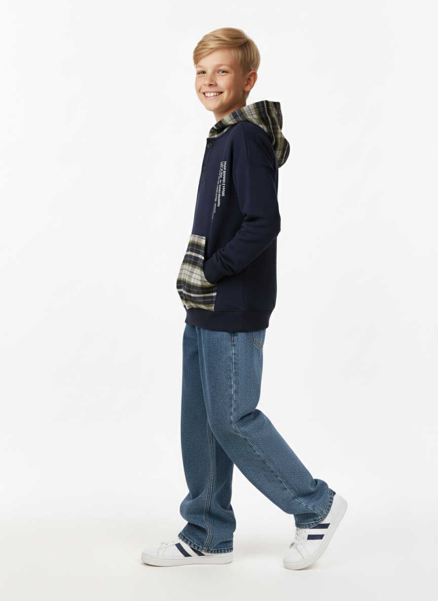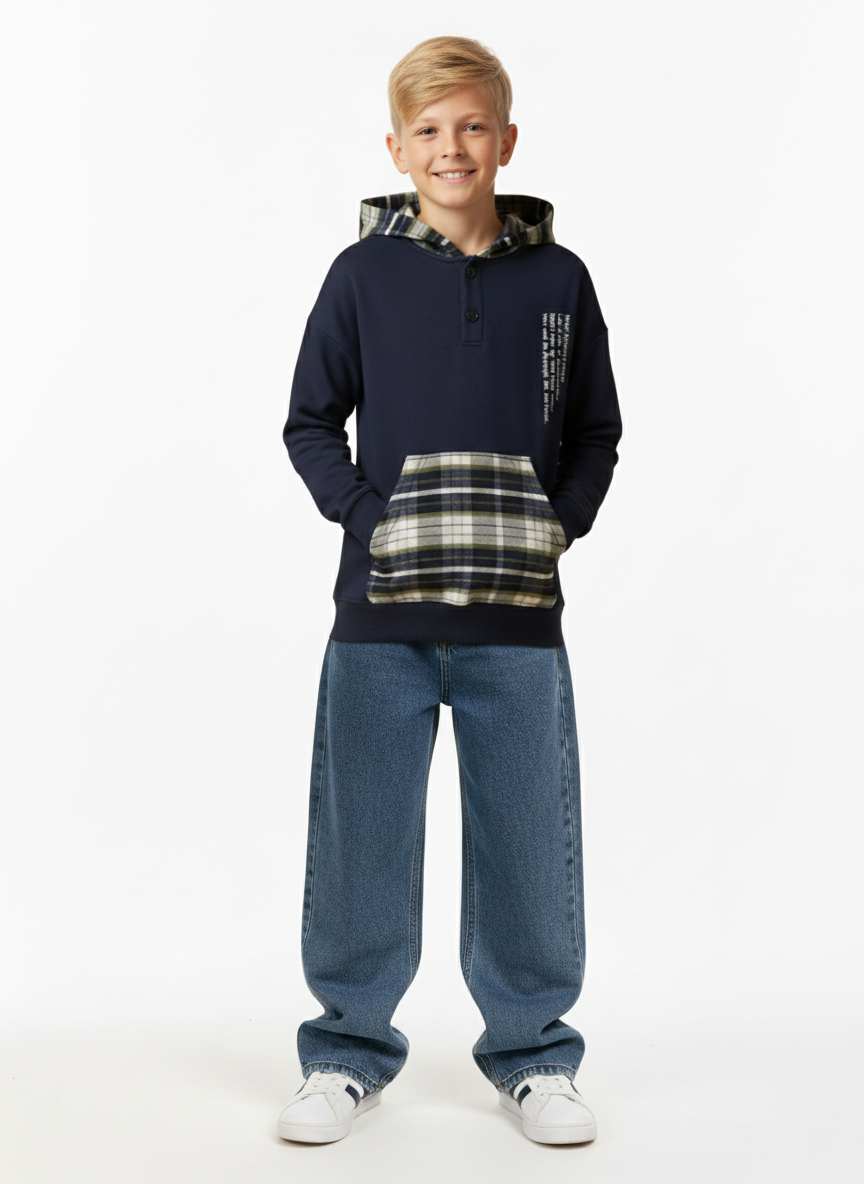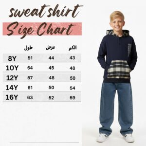 ملابس أطفال شتوية من براند A&A تمنح طفلك الدفء الذي يحتاجه مع مظهر كلاسيكي متجدد. يتميز هذا السويت شيرت بلونه الكحلي الفخم مع تفاصيل “الكاروهات” الراقية التي تزين الكابيشو والجيب الأمامي. صممنا هذا الموديل خصيصاً لفئة أولادى كبير ليناسب الشباب من سن 8 سنوات حتى 16 سنة بكل أناقة.